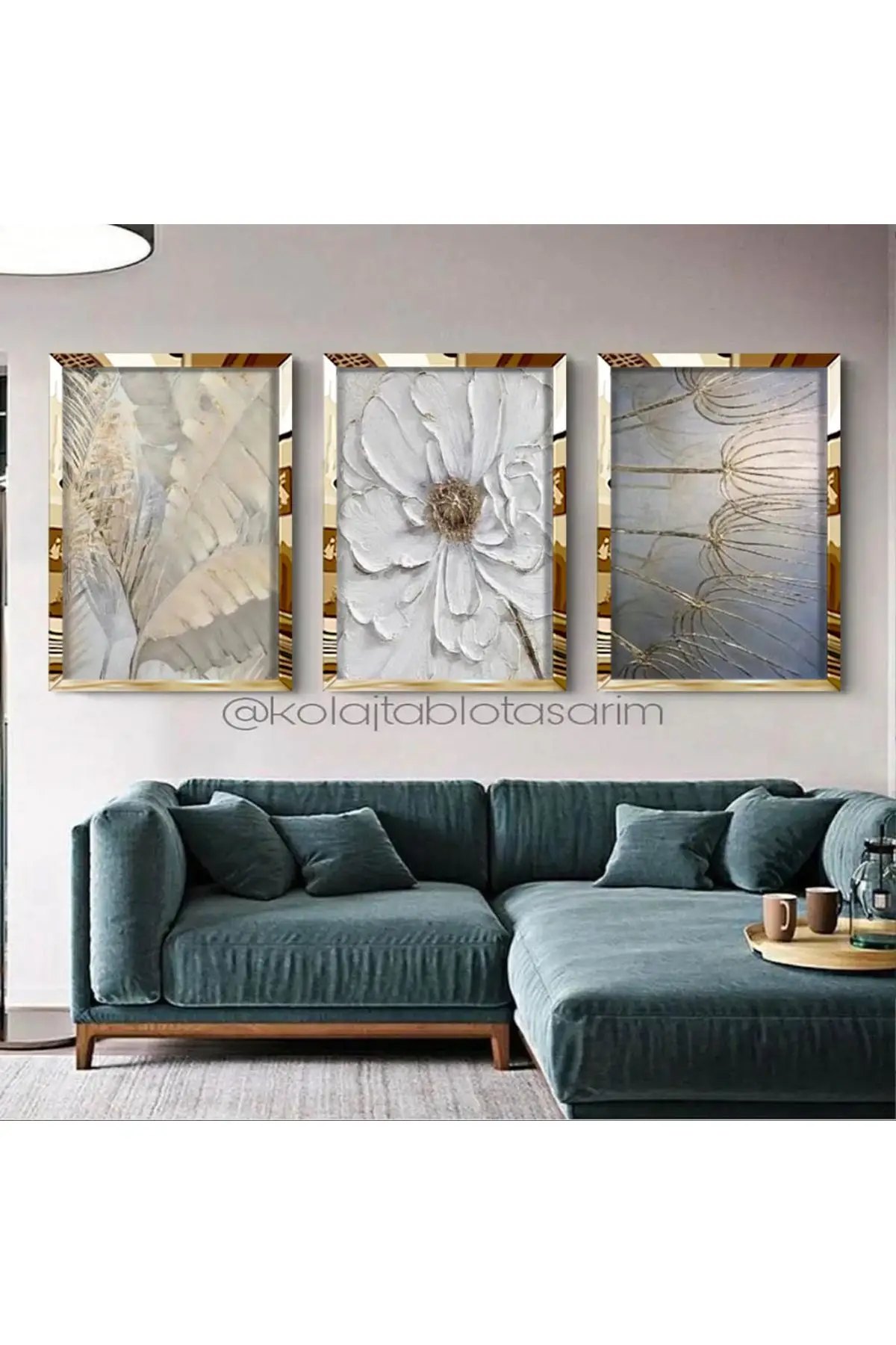3'lü Gold Pleksi Dekoratif Çiçekler Çerçeveli Tablo Seti Hakkında