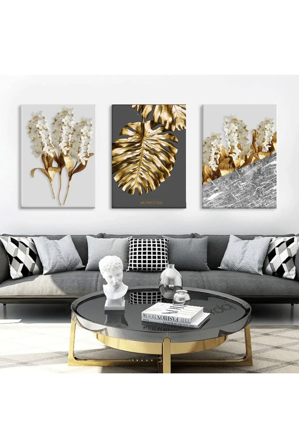 Altın Çiçekler Dekoratif Soyut 3'lü Kanvas Tablo Seti Hakkında