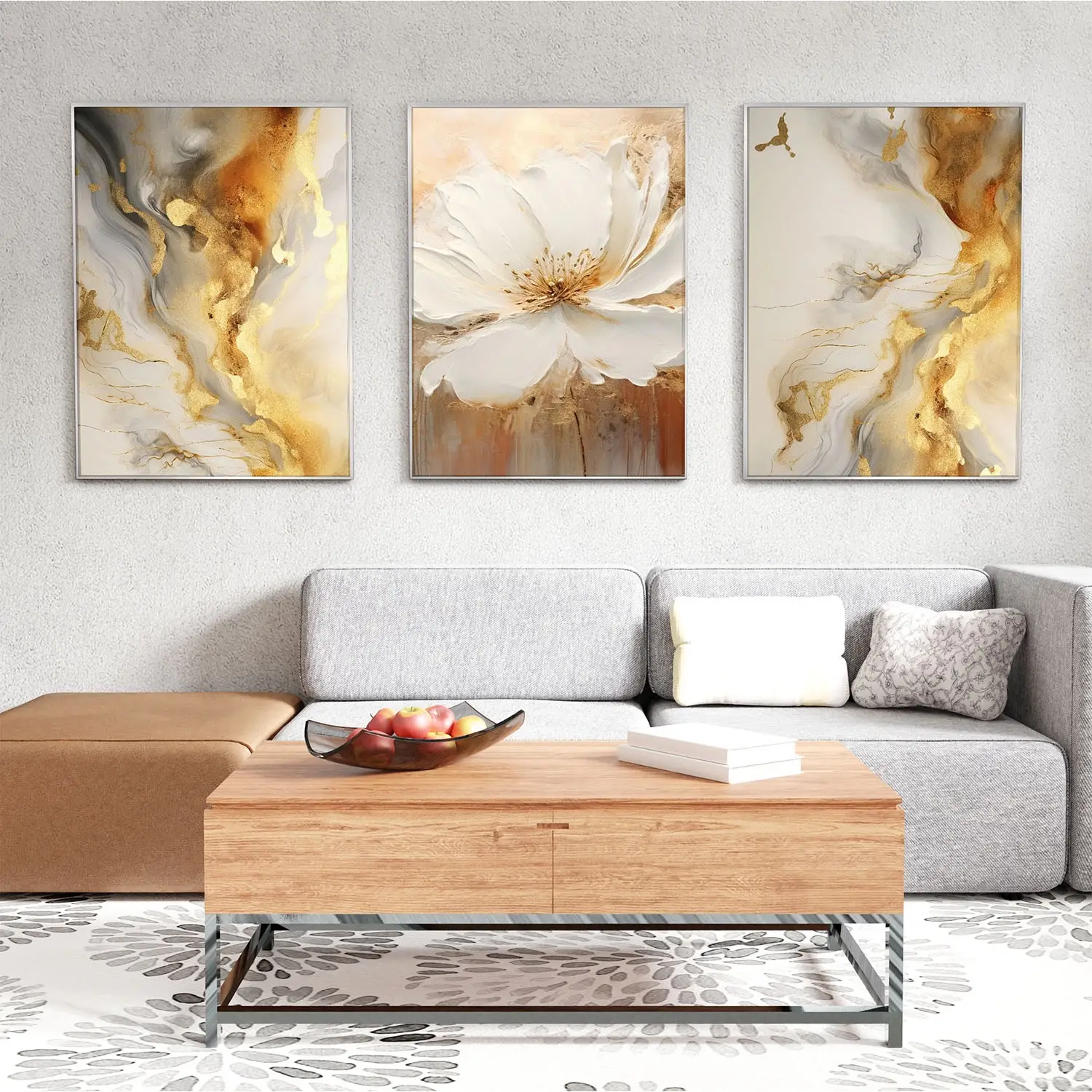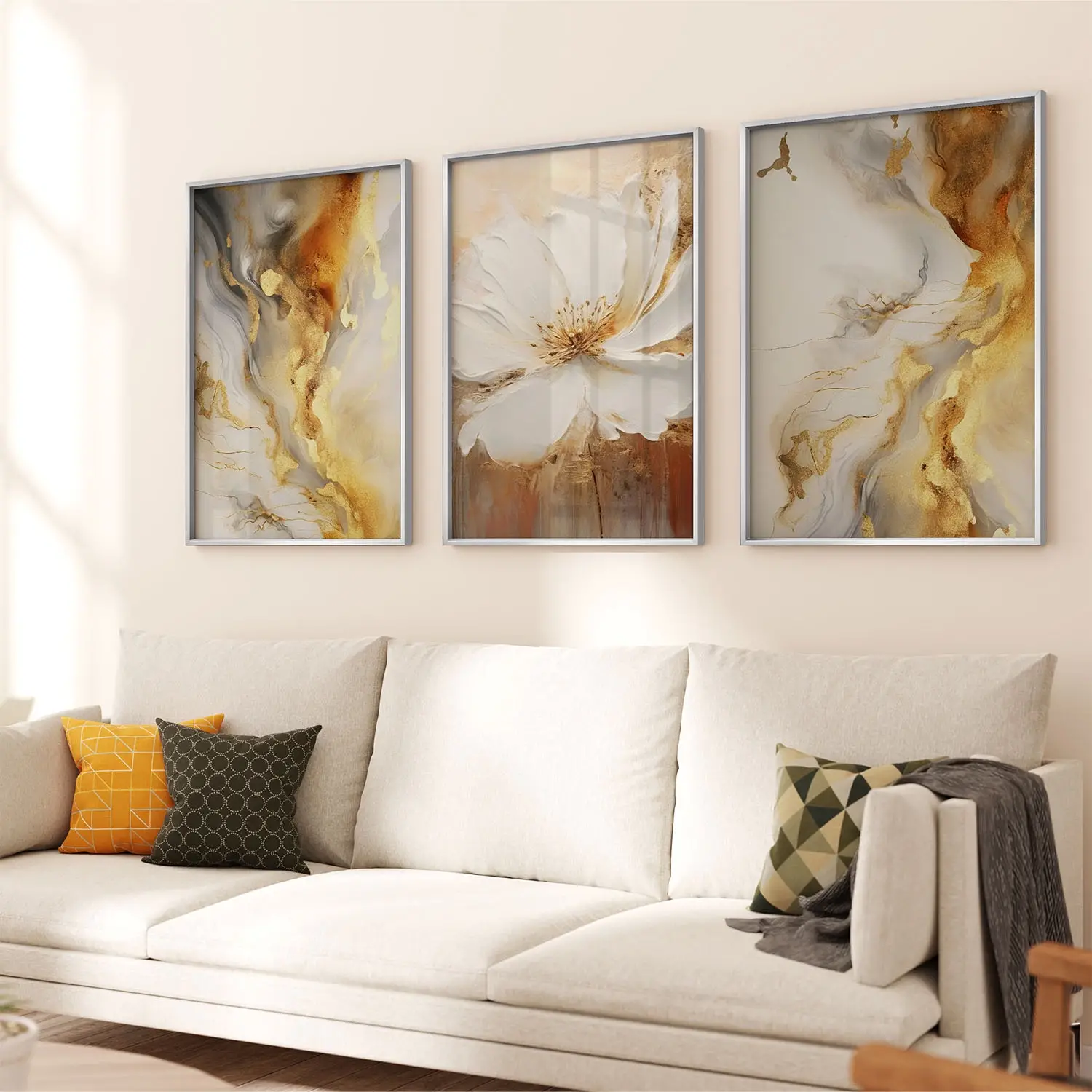 Altın Çiçekler Temalı Üçlü Metal Çerçeveli Tablo Seti Hakkında