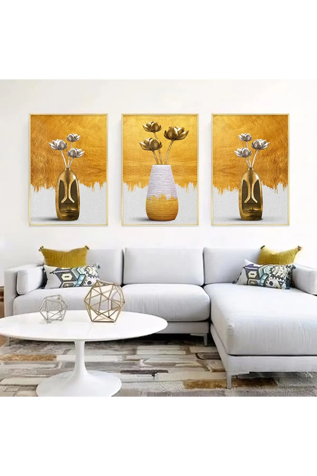 Bu tablo seti, altın arka plan üzerinde zarif vazolar içindeki çiçeklerle yaşam alanınıza baharın tazeliğini getiriyor. Her bir eser, farklı bir hikaye anlatıyor ve %100 alüminyum metal çerçeve ile öne çıkıyor.