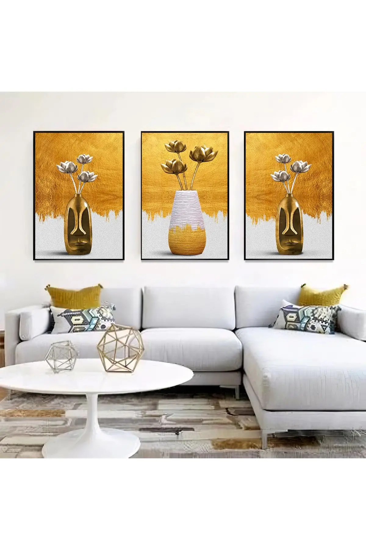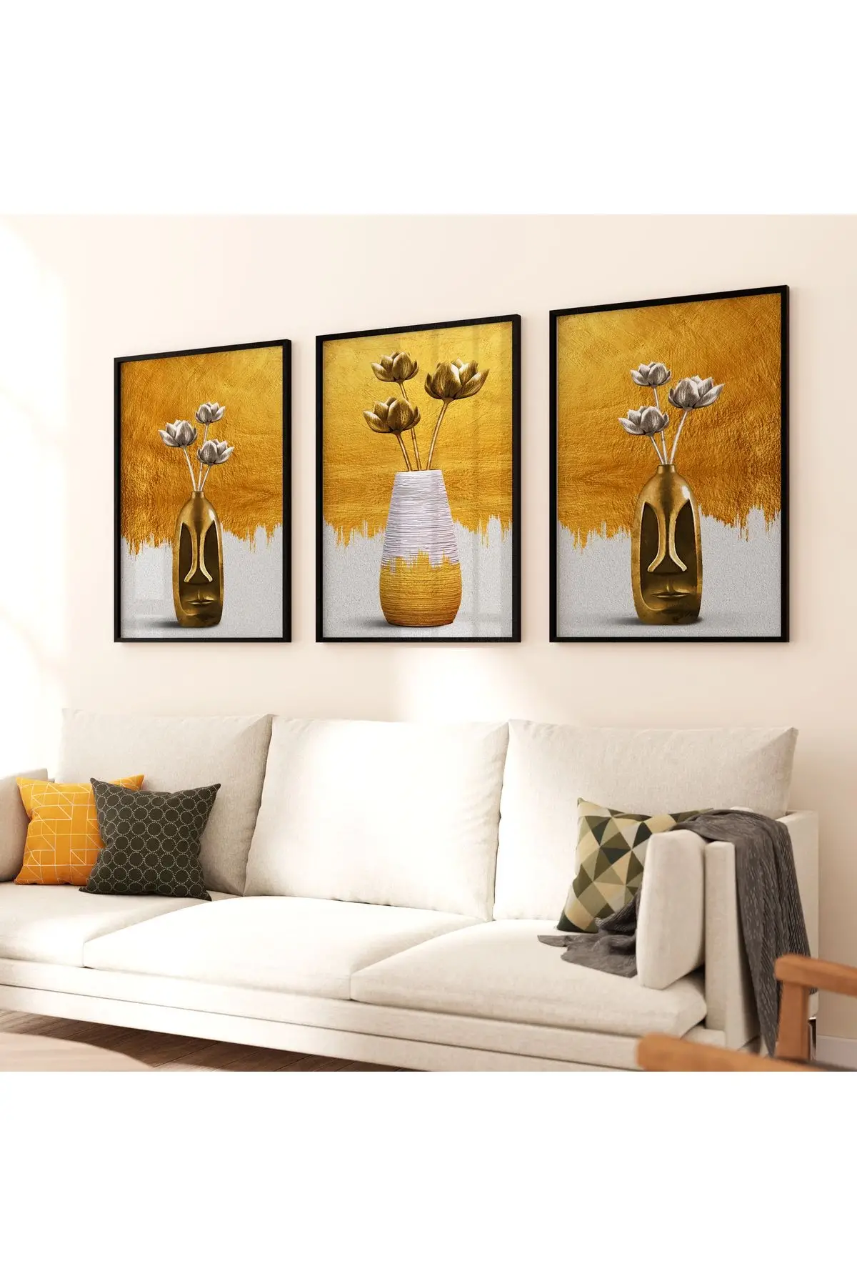 Bu tablo seti, altın arka plan üzerinde zarif vazolar içindeki çiçeklerle yaşam alanınıza baharın tazeliğini getiriyor. Her bir eser, farklı bir hikaye anlatıyor ve %100 alüminyum metal çerçeve ile öne çıkıyor.