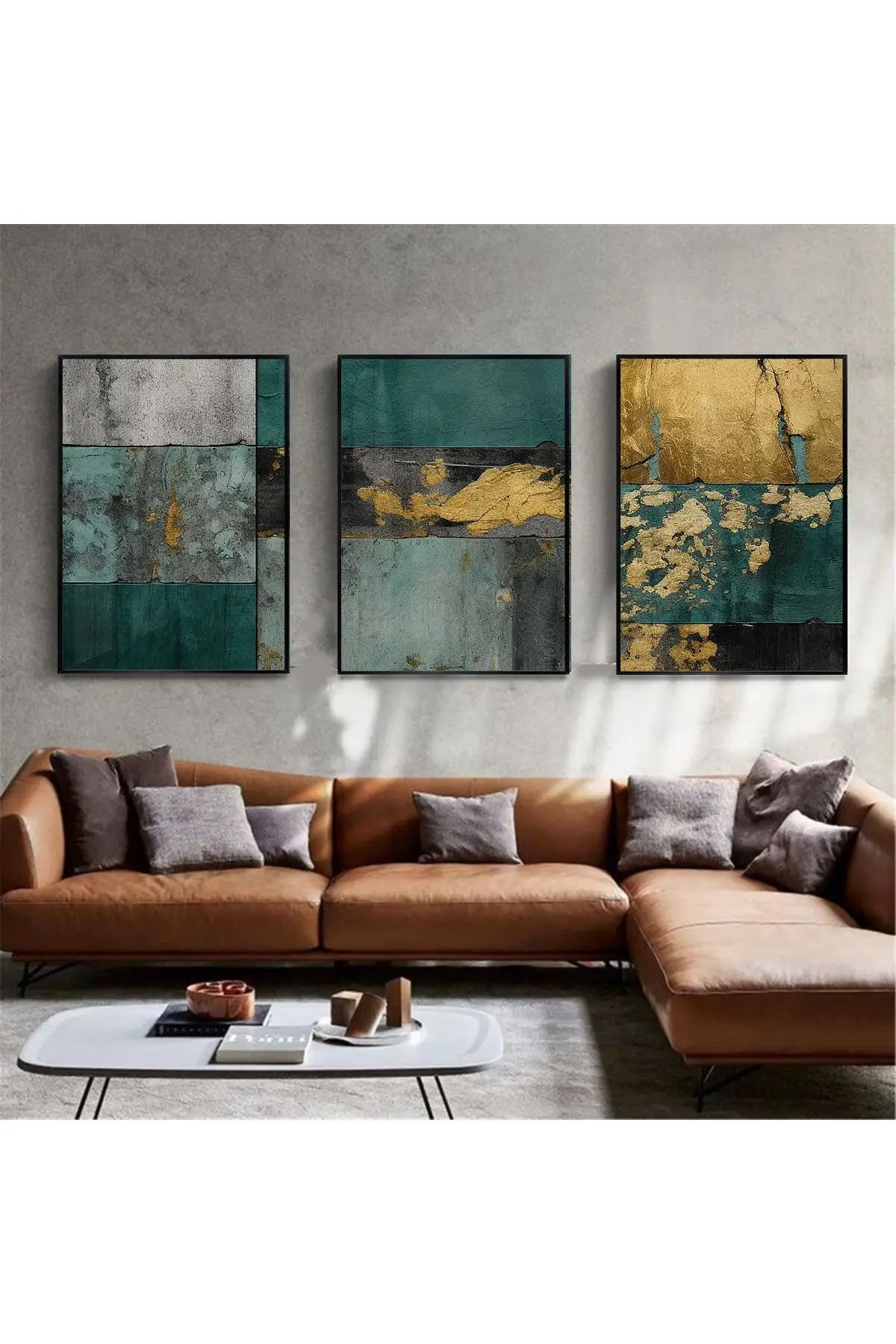 Altın Dokunuş: Turkuaz ve Gri Üçlü Metal Çerçeveli Tablo Takımı