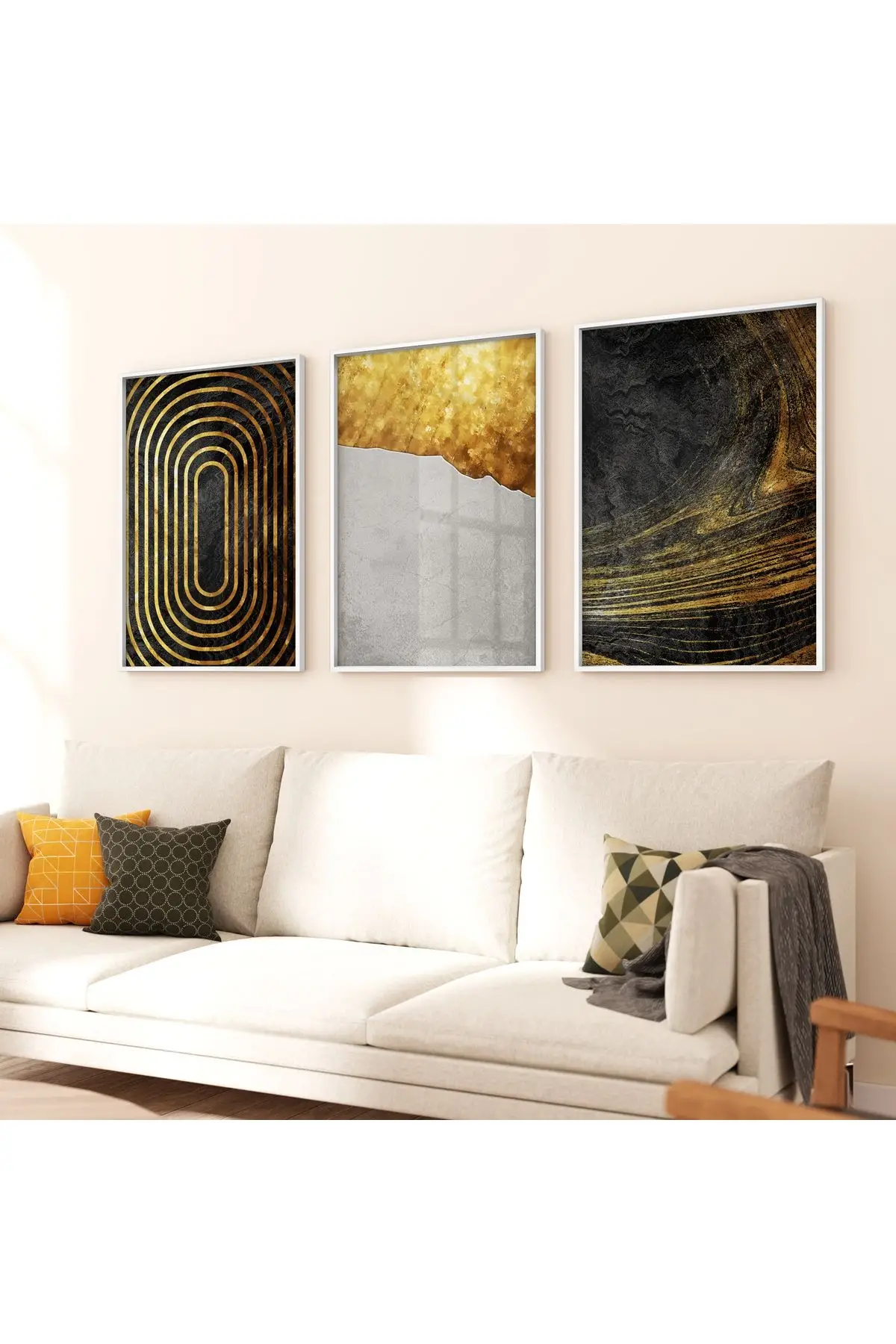 Bu etkileyici üçlü tablo seti, modern ve şık bir tasarıma sahiptir. Sol taraftaki tablo, siyah ve altın renkli konsantrik ovalarla optik bir illüzyon yaratırken, ortadaki tablo, altın dokunuşlarla zenginleştirilmiş gri-beyaz bir yüzeyi andırıyor. Sağdaki tablo ise, doğal bir manzaranın soyut bir temsilini sunuyor; koyu tonlar arasında parlayan altın ışık huzmeleriyle dikkat çekiyor.Her bir tablo %100 Alüminyum Metal Çerçeve, Gerçek Kırılmaz Tablo Camı ve UV Baskı teknolojisi ile uzun ömürlü bir görsellik sunar.