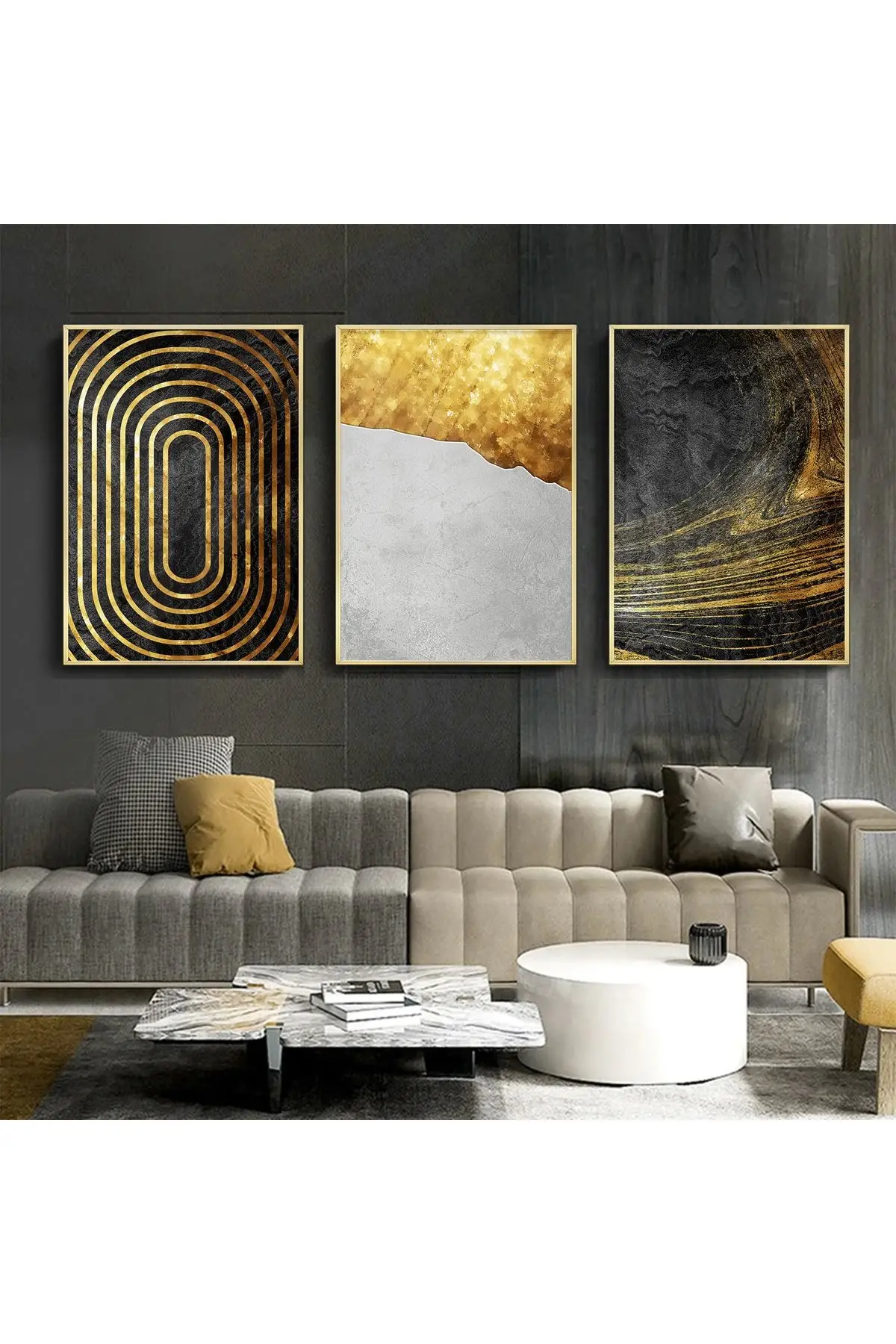 Bu etkileyici üçlü tablo seti, modern ve şık bir tasarıma sahiptir. Sol taraftaki tablo, siyah ve altın renkli konsantrik ovalarla optik bir illüzyon yaratırken, ortadaki tablo, altın dokunuşlarla zenginleştirilmiş gri-beyaz bir yüzeyi andırıyor. Sağdaki tablo ise, doğal bir manzaranın soyut bir temsilini sunuyor; koyu tonlar arasında parlayan altın ışık huzmeleriyle dikkat çekiyor.Her bir tablo %100 Alüminyum Metal Çerçeve, Gerçek Kırılmaz Tablo Camı ve UV Baskı teknolojisi ile uzun ömürlü bir görsellik sunar.