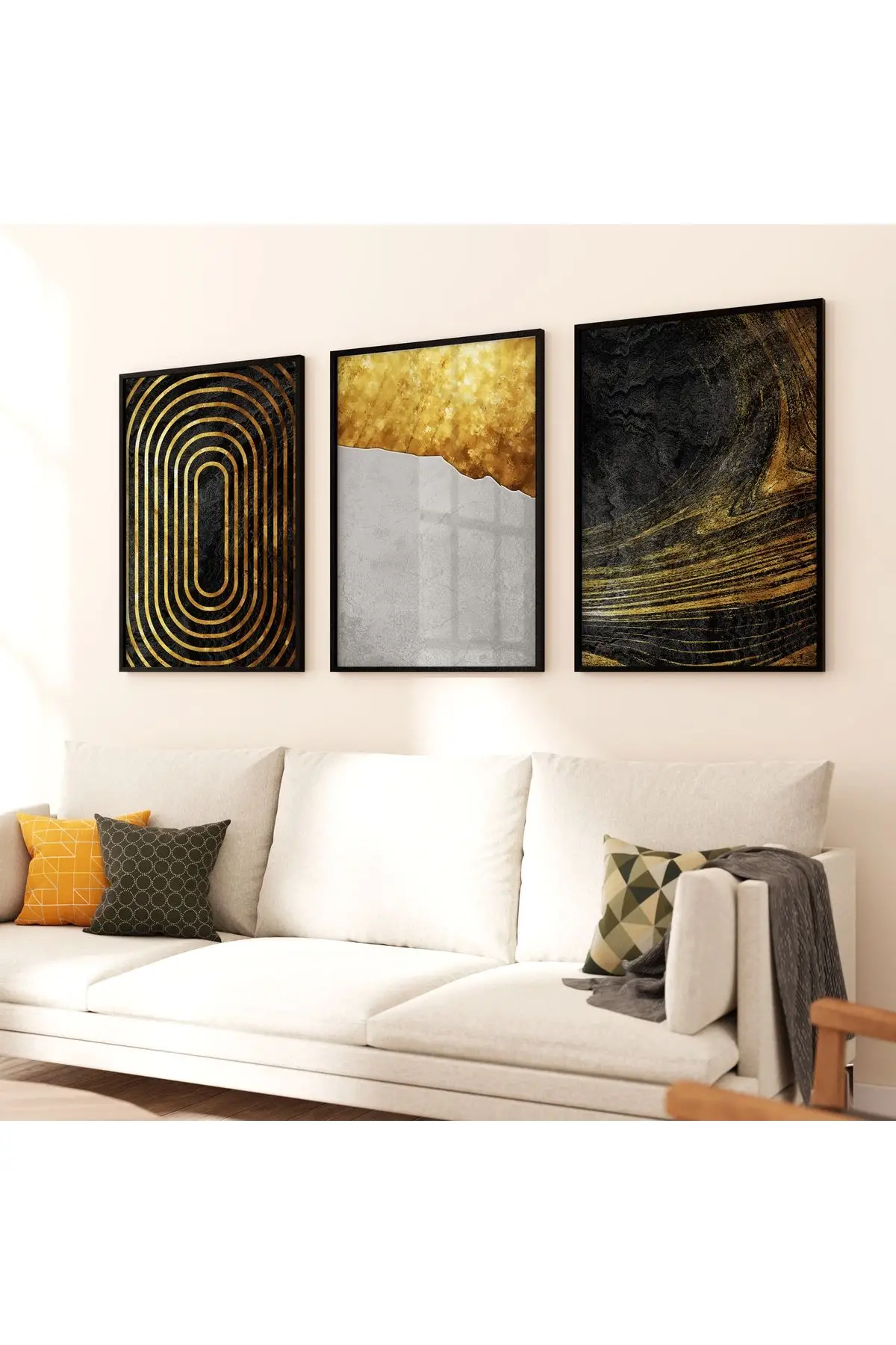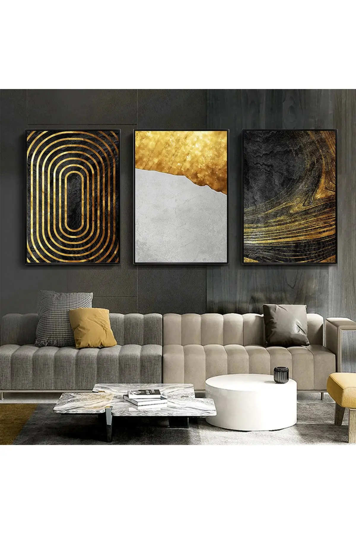 Bu etkileyici üçlü tablo seti, modern ve şık bir tasarıma sahiptir. Sol taraftaki tablo, siyah ve altın renkli konsantrik ovalarla optik bir illüzyon yaratırken, ortadaki tablo, altın dokunuşlarla zenginleştirilmiş gri-beyaz bir yüzeyi andırıyor. Sağdaki tablo ise, doğal bir manzaranın soyut bir temsilini sunuyor; koyu tonlar arasında parlayan altın ışık huzmeleriyle dikkat çekiyor.Her bir tablo %100 Alüminyum Metal Çerçeve, Gerçek Kırılmaz Tablo Camı ve UV Baskı teknolojisi ile uzun ömürlü bir görsellik sunar.