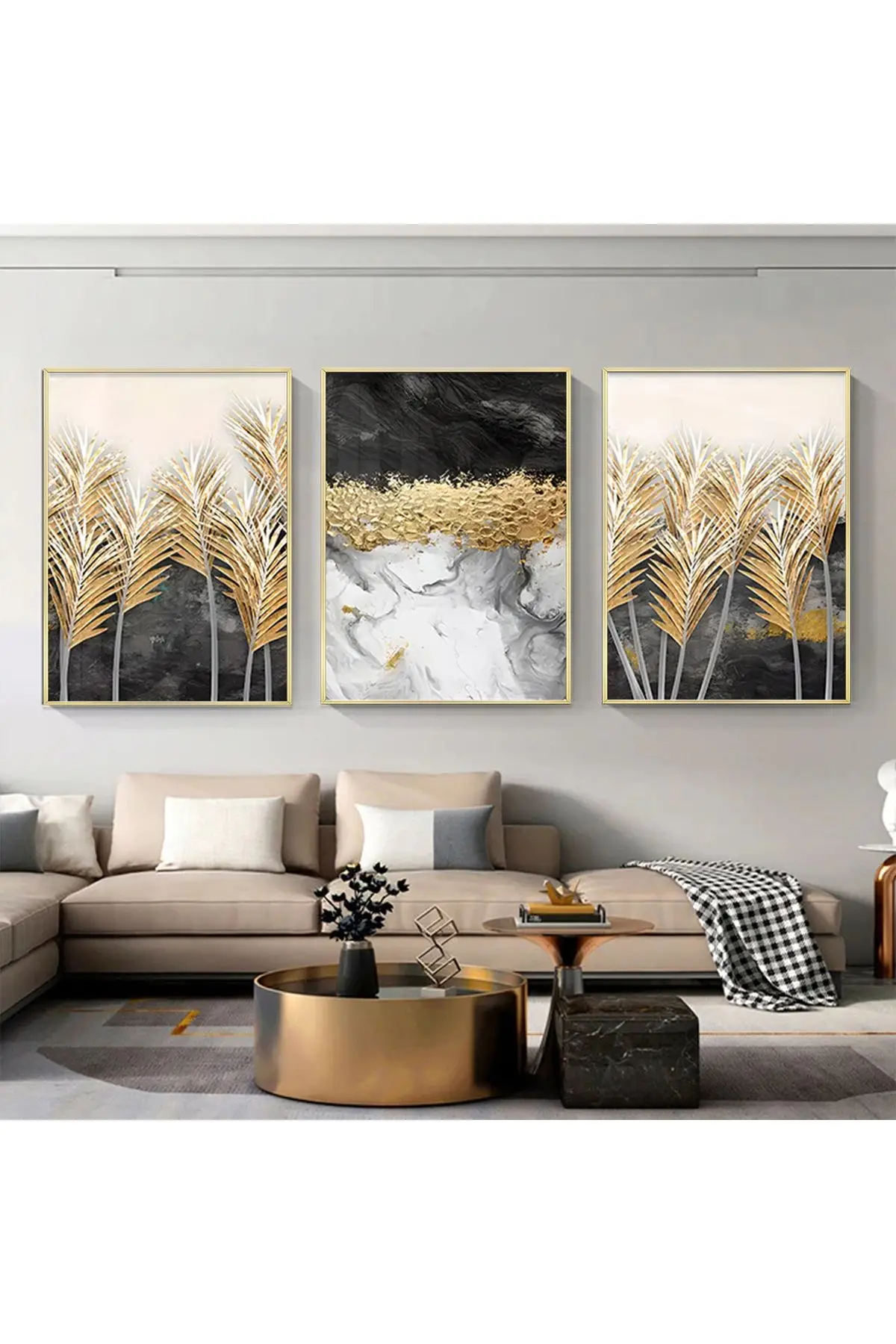 Altın Palmiye Rüyası: Üçlü Soyut Metal Çerçeveli Tablo Hakkında