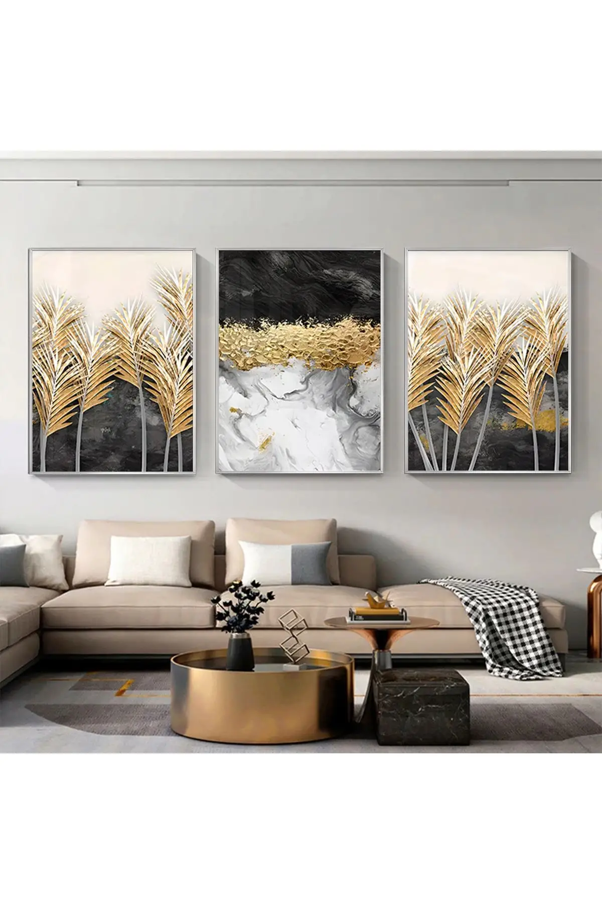 Altın Palmiye Rüyası: Üçlü Soyut Metal Çerçeveli Tablo Hakkında
