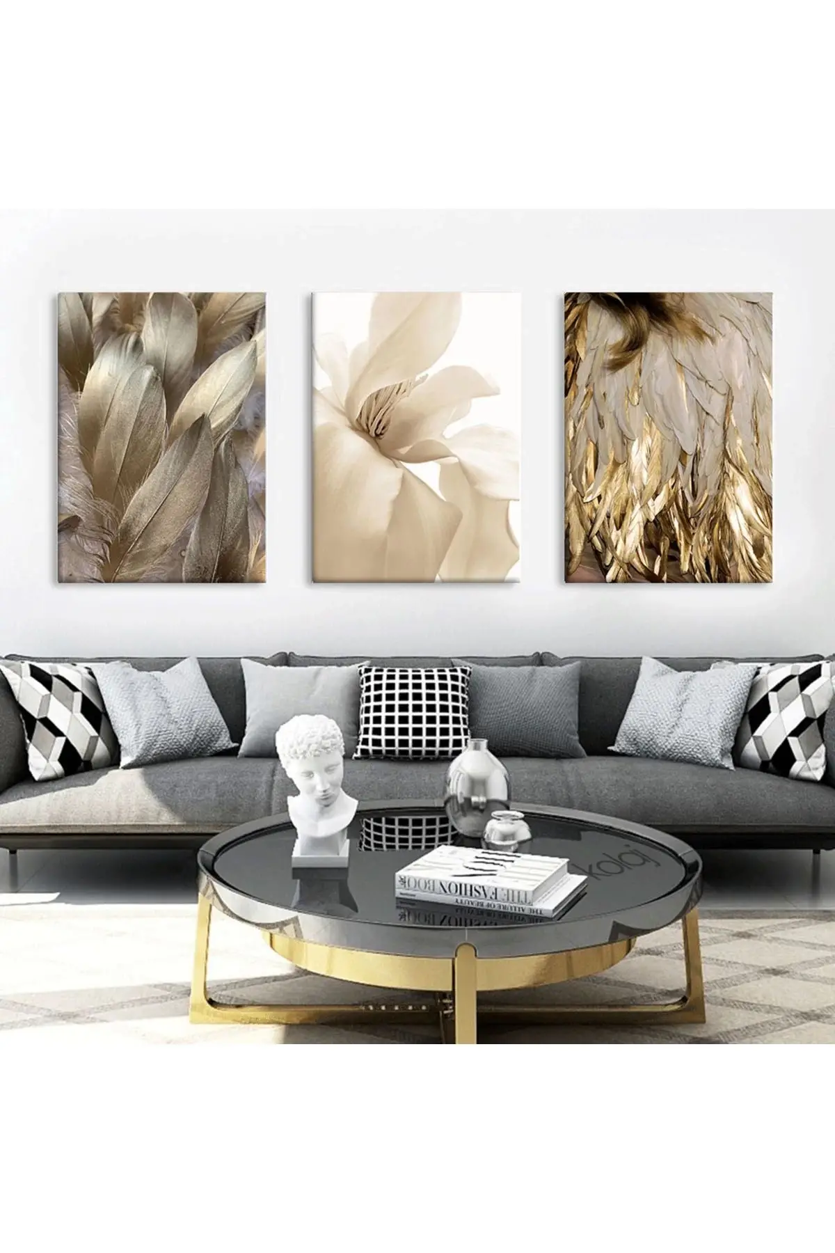 Altın Tüyler ve Yapraklar Dekoratif Çiçek Temalı Üçlü Kanvas Tablo Seti Hakkında