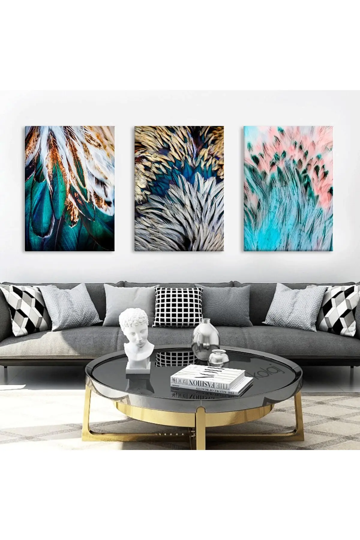 Altın Yeşil ve Pembe Soyut Tavus Kuşu Tüyleri Dekoratif Üçlü Kanvas Tablo Hakkında