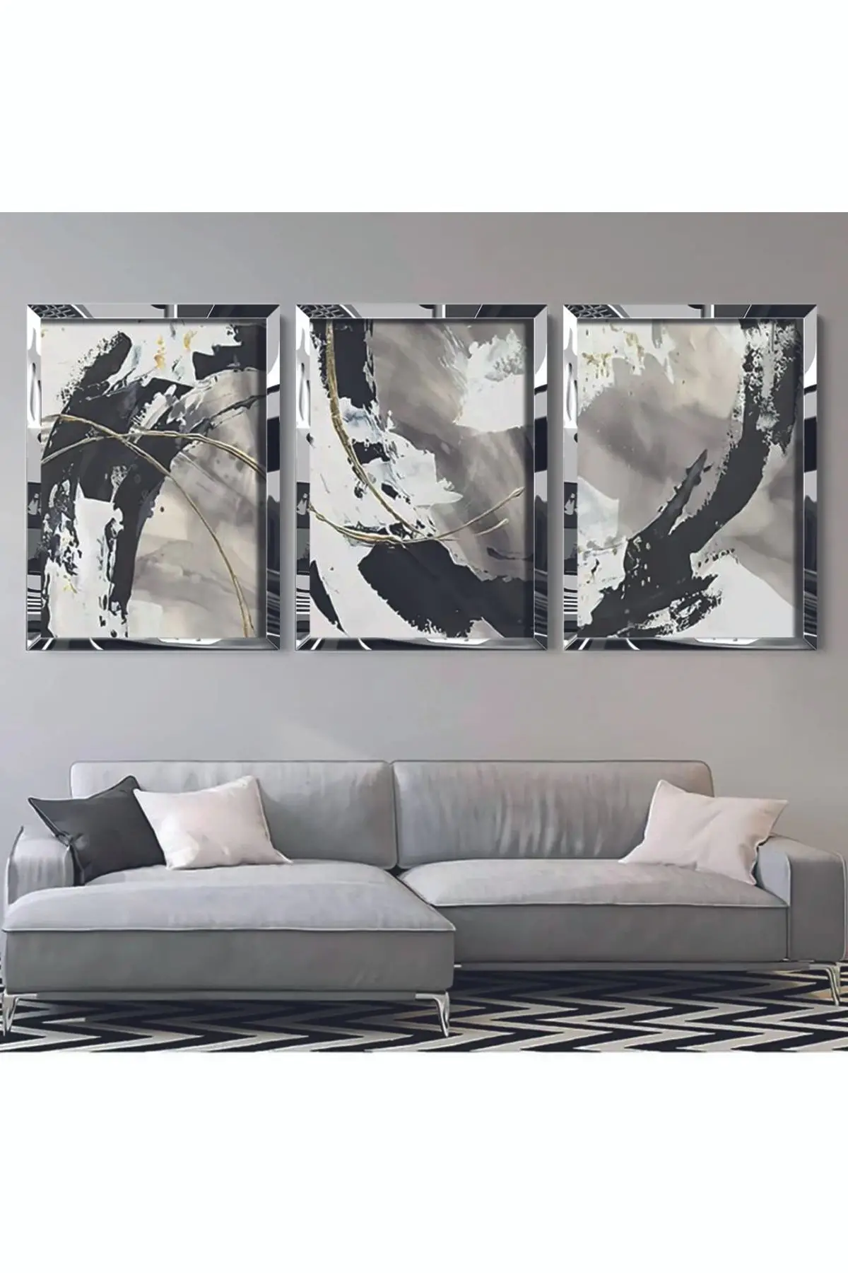Ayna Çerçeveli Üçlü Gümüş Renkli Çerçeve Soyut Siyah Beyaz Tablo Seti Hakkında