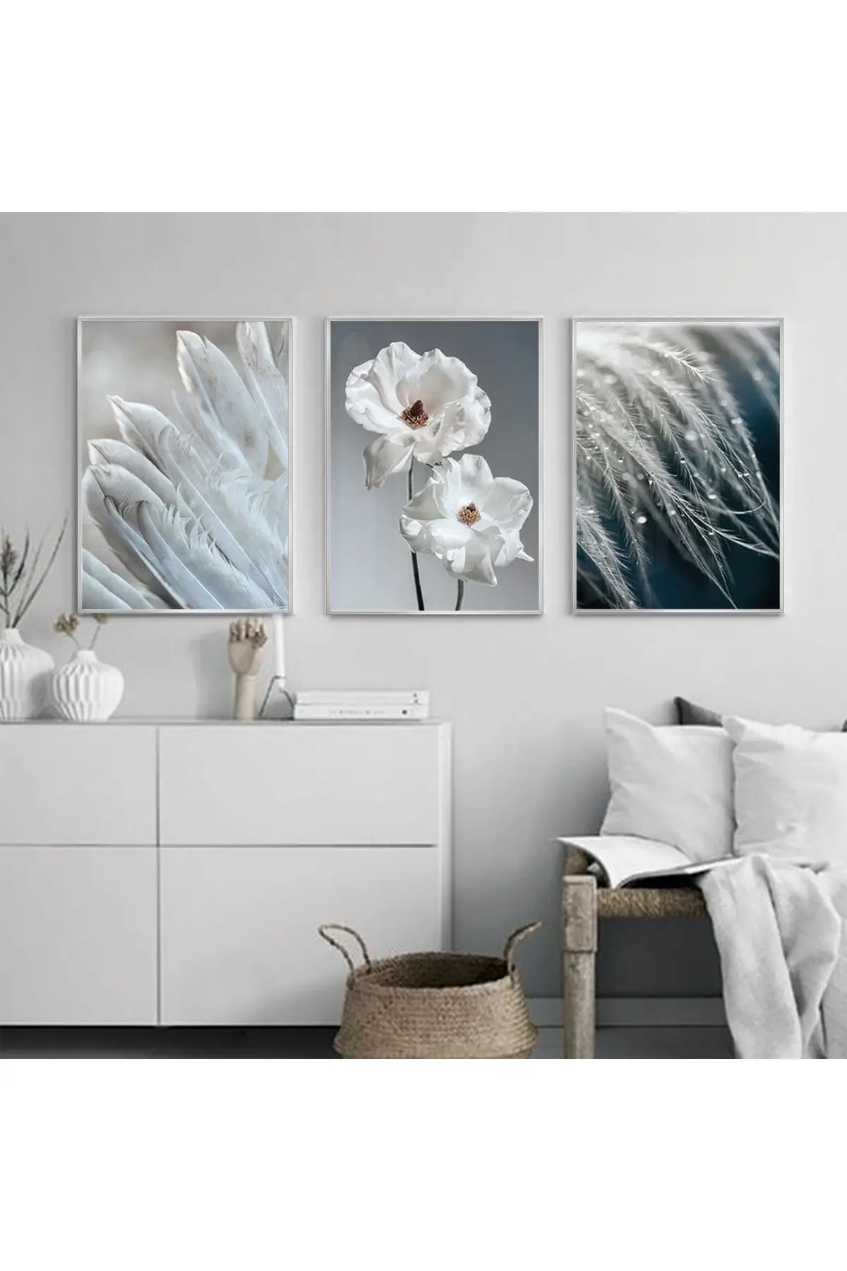 Beyazın Huzur Veren Tonları Tüy Ve Çiçek Illüstrasyonlu Üçlü Metal Çerçeveli Tablo Seti Hakkında