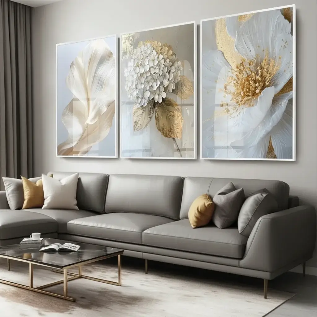 Estetiği ve zarafeti bir arada sunan KOLAJTASARIM marka Çiçek Desenli Altın Detaylı Beyaz Metal Çerçeveli Cam Tablo, yaşam alanlarınıza şıklık katacak. Bu üçlü set, özel çiçek desenleri ve altın detaylarla tasarlanmış metal çerçevelere sahiptir.