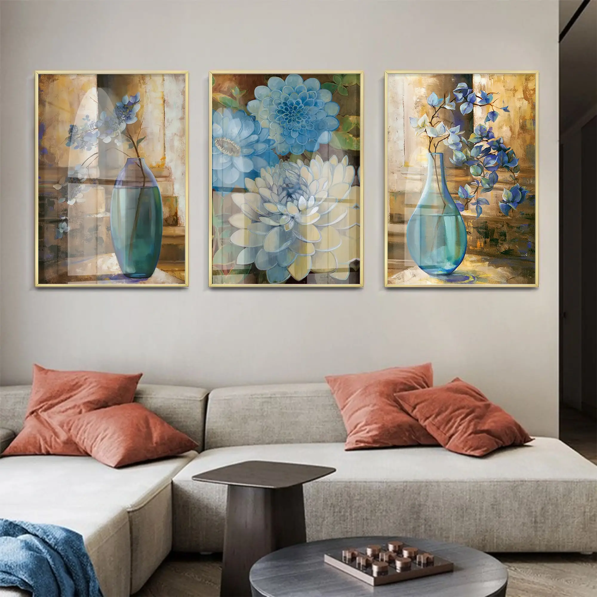 - Üç parçadan oluşan bu tablo seti, çarpıcı çiçek deseniyle tasarlanmış ve mavi tonlarıyla ön plana çıkmaktadır.