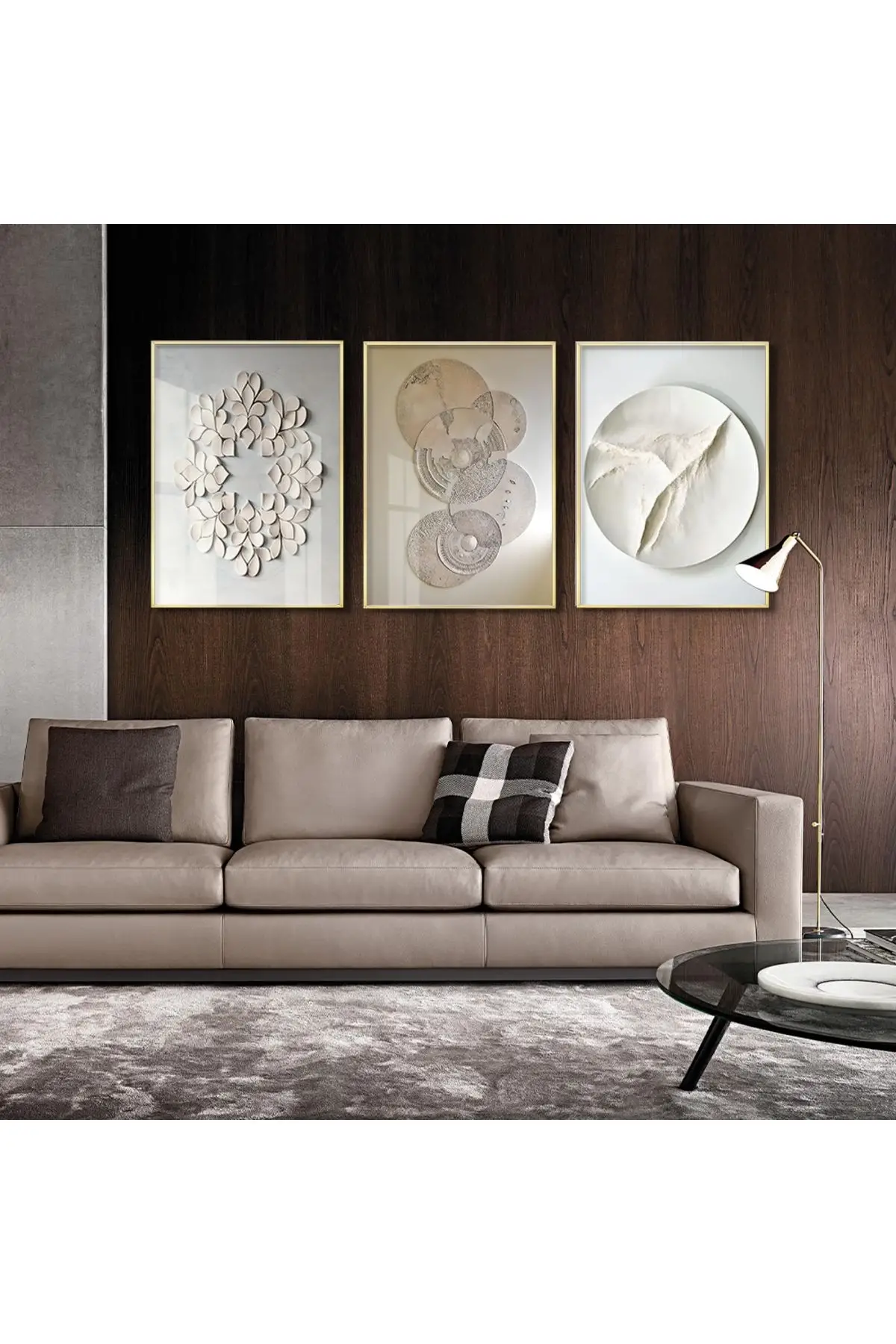 Bu üçlü tablo seti, doğanın çeşitli dokularını ve desenlerini soyut bir bakış açısıyla yorumlar. Gri tonlarında yaprak benzeri şekiller, karmaşık dairesel desenler ve tekstürlü beyaz kumaş sanatı, her biri farklı bir hikaye anlatırken bir arada uyum içinde durur. %100 alüminyum metal çerçeve ve gerçek kırılmaz cam kullanılarak üretilmiş bu eserler, UV baskı teknolojisi ile canlı renkler ve uzun ömürlü bir görsel deneyim sunar. Modern ve şık bir oturma odasının duvarını süsleyen bu eserler, mekanınıza sofistike bir dokunuş ekler ve doğal güzelliklerin estetiğini vurgular.