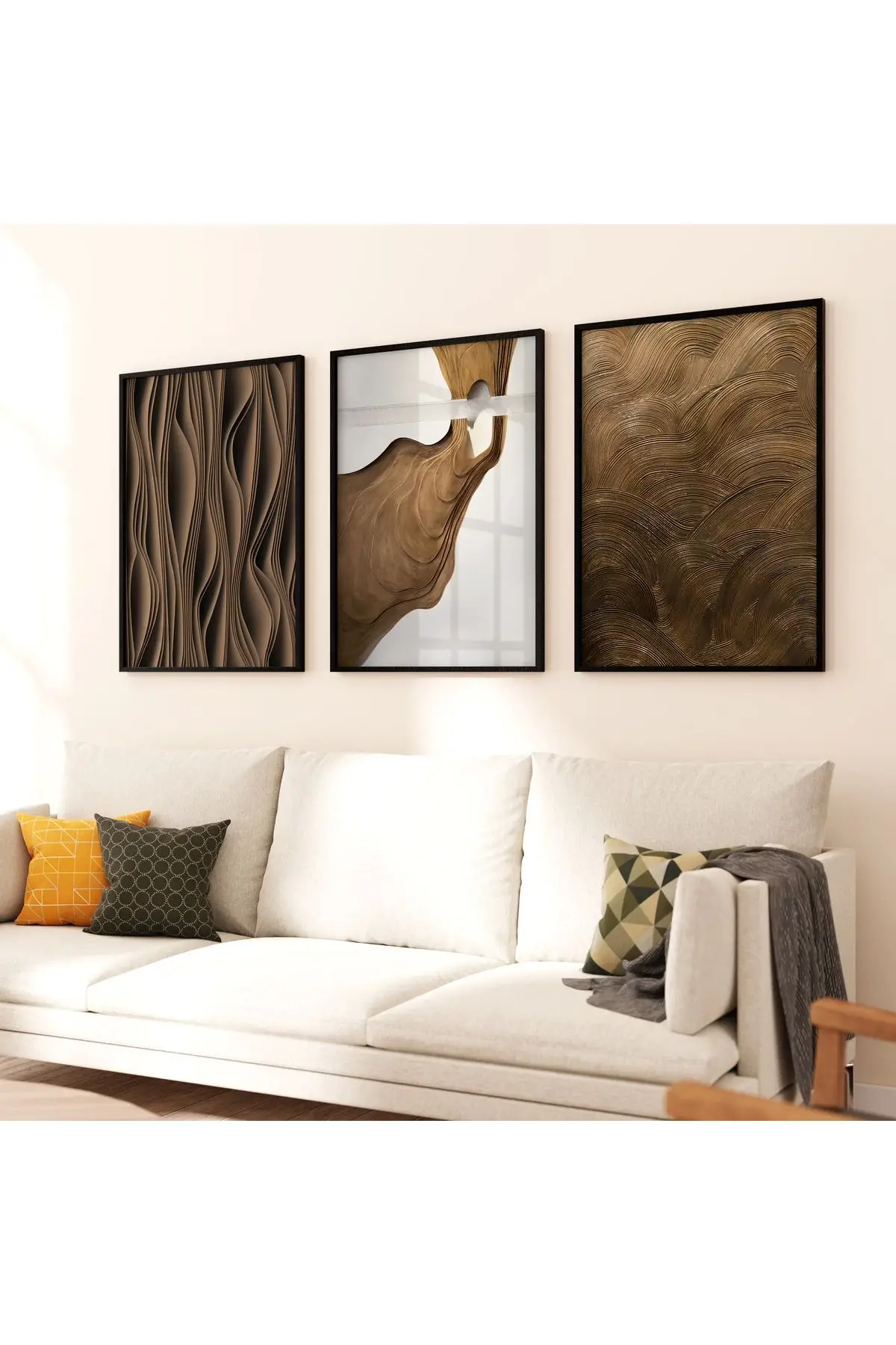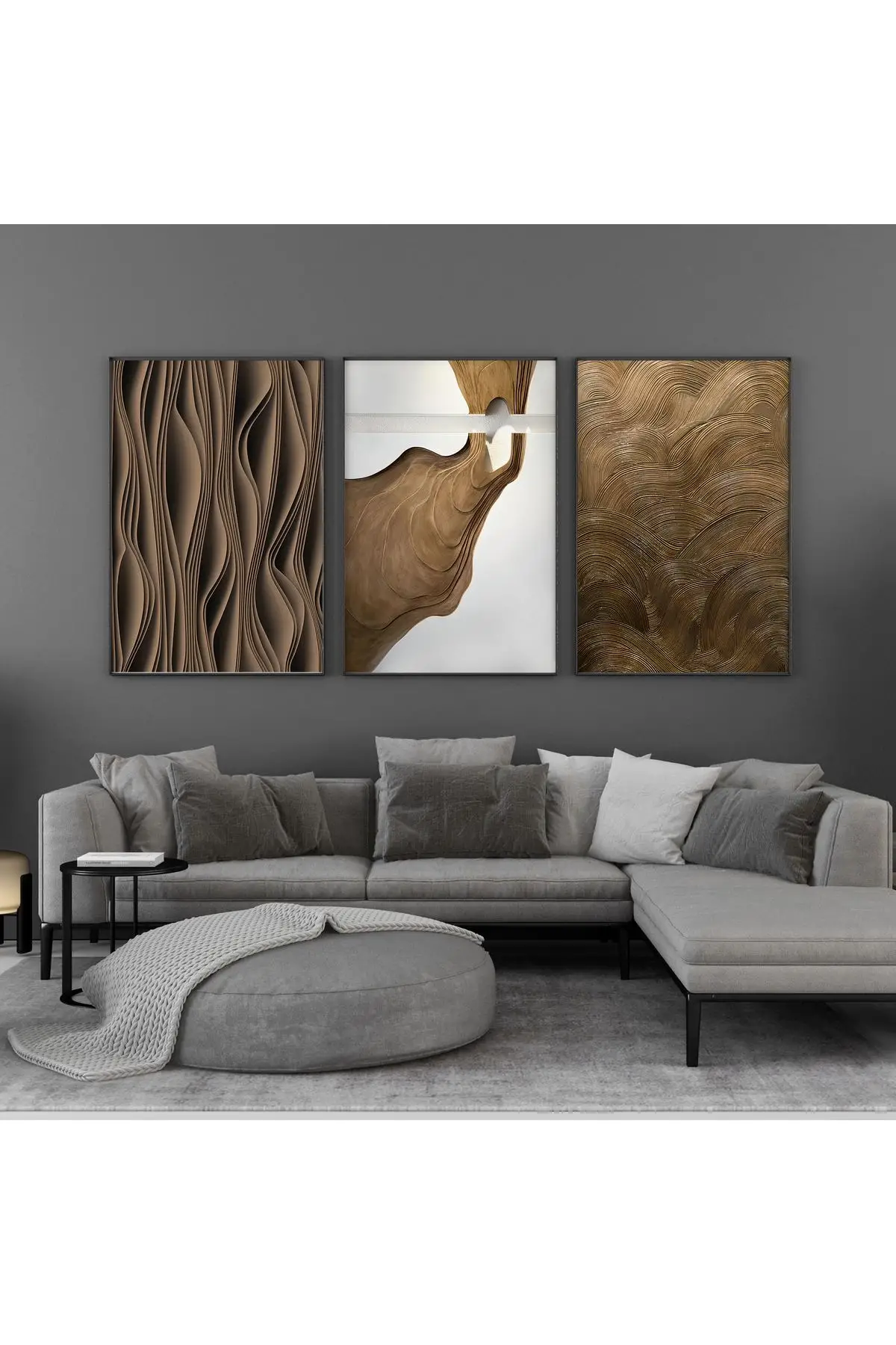 Bu tablo seti, soyut dalgalı çizgilerle dinamik ve akıcı bir görsel etki yaratır. Gri tonlarındaki rahat kanepe üzerinde asılı durarak, odanın modern atmosferine hareket katıyor.