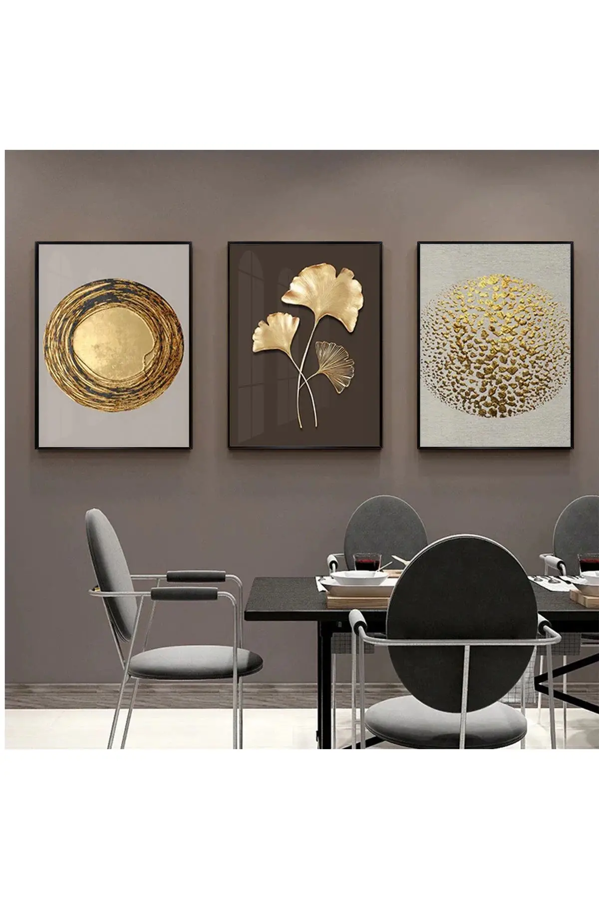 Doğanın Altın İmzası: Üçlü Soyut Metal Çerçeveli Tablo Seti Hakkında