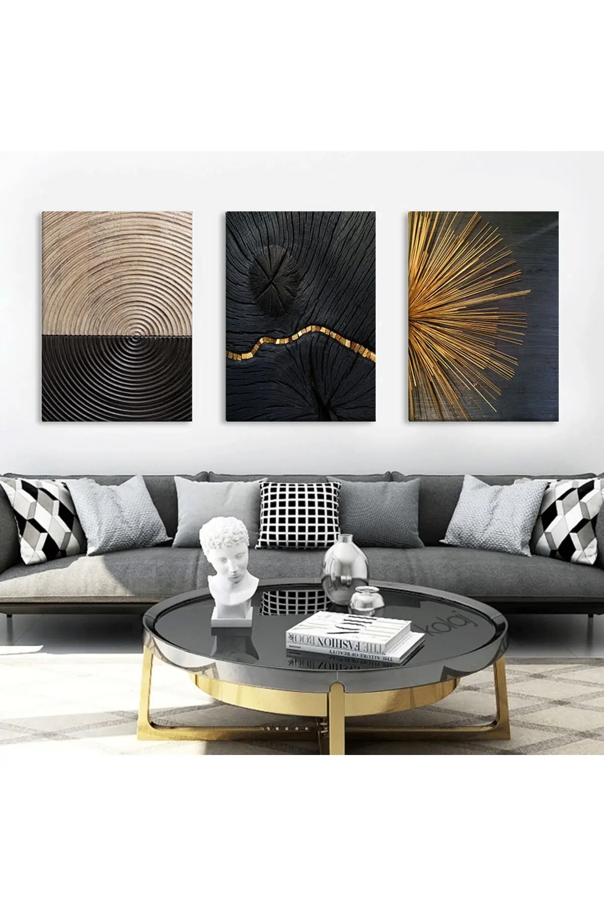 Doğanın İzleri: Altın Detaylı Soyut Kütükler Üçlü Tablo Seti Hakkında