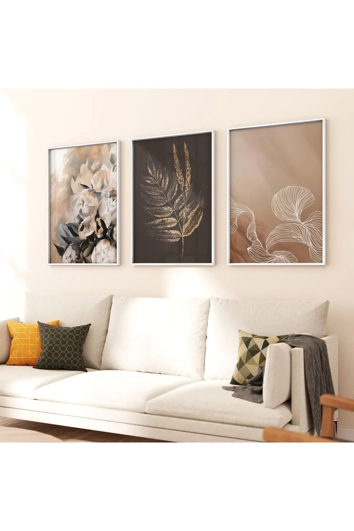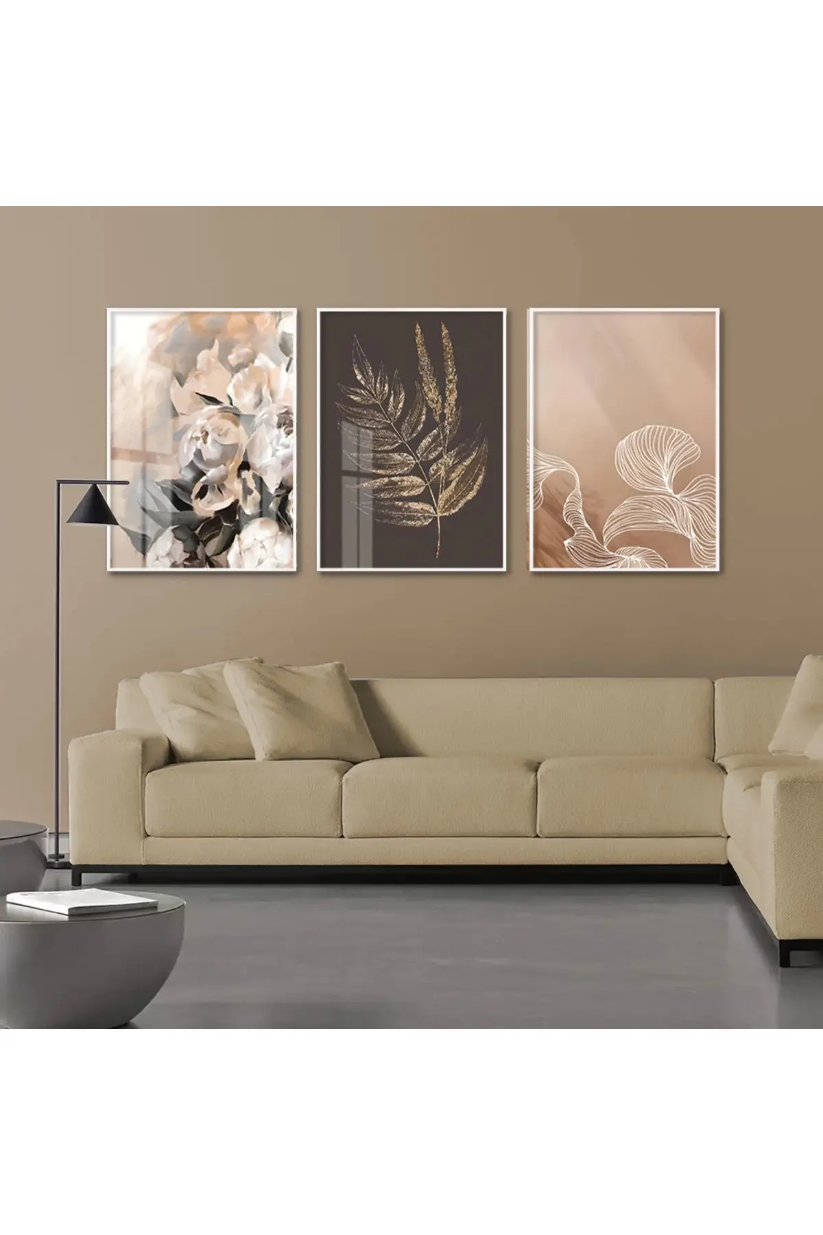 Bu üçlü tablo seti, doğanın incelikli güzelliklerini soyut bir perspektifle ele alır. İlk eser, rüya gibi bir hava yaratan yumuşak odaklı pembe çiçekleri betimlerken, ikinci eser detaylı çizimlerle yaprak veya tüyleri ön plana çıkarır. Üçüncü eser ise, zarif bir beyaz çiçeği, belirgin yaprakları ve çiçek tozları ile gösterir. Bu sanat eserleri, sade ve modern bir oturma odasına doğal bir zarafet katarken, %100 alüminyum metal çerçeve ve gerçek kırılmaz cam ile kalitesini ve estetiğini uzun süre korur.
