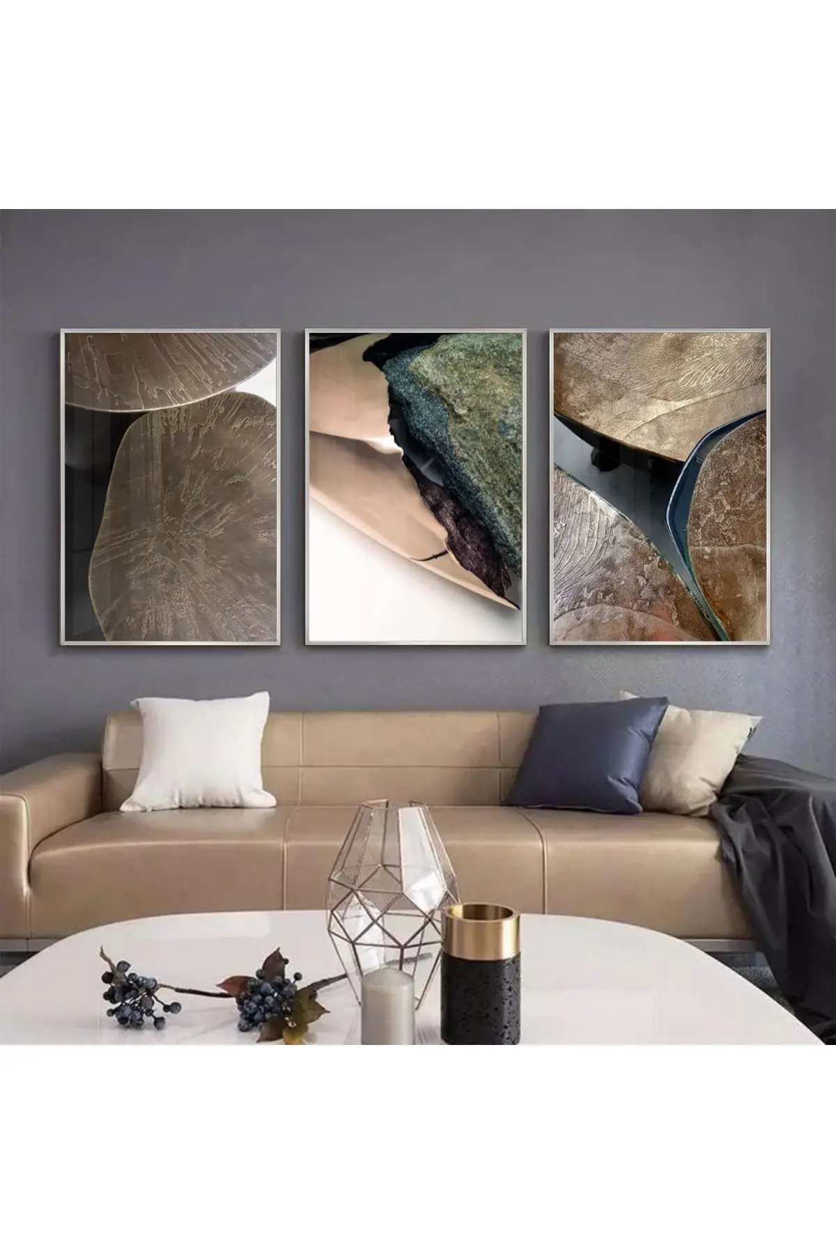 Dokusal Zenginlik: Ahşap, Taş ve Metalin Soyut Dansı Üçlü Metal Çerçeveli Tablo Seti Hakkında