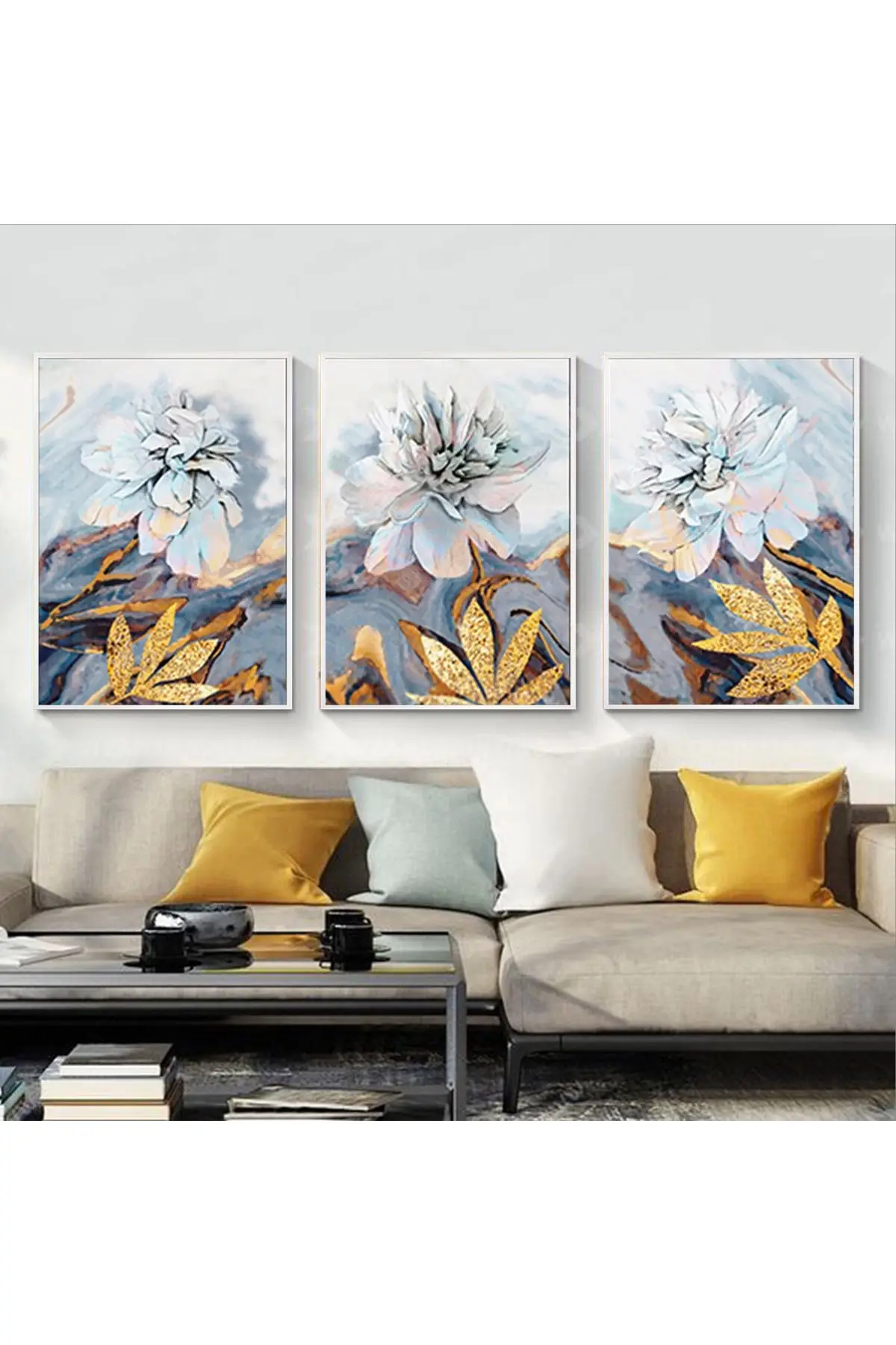 Elegans Çiçek Triptikleri: Altın Vurgulu Modern Sanatsal Beyaz Metal Çerçeveli Tablo Seti Hakkında