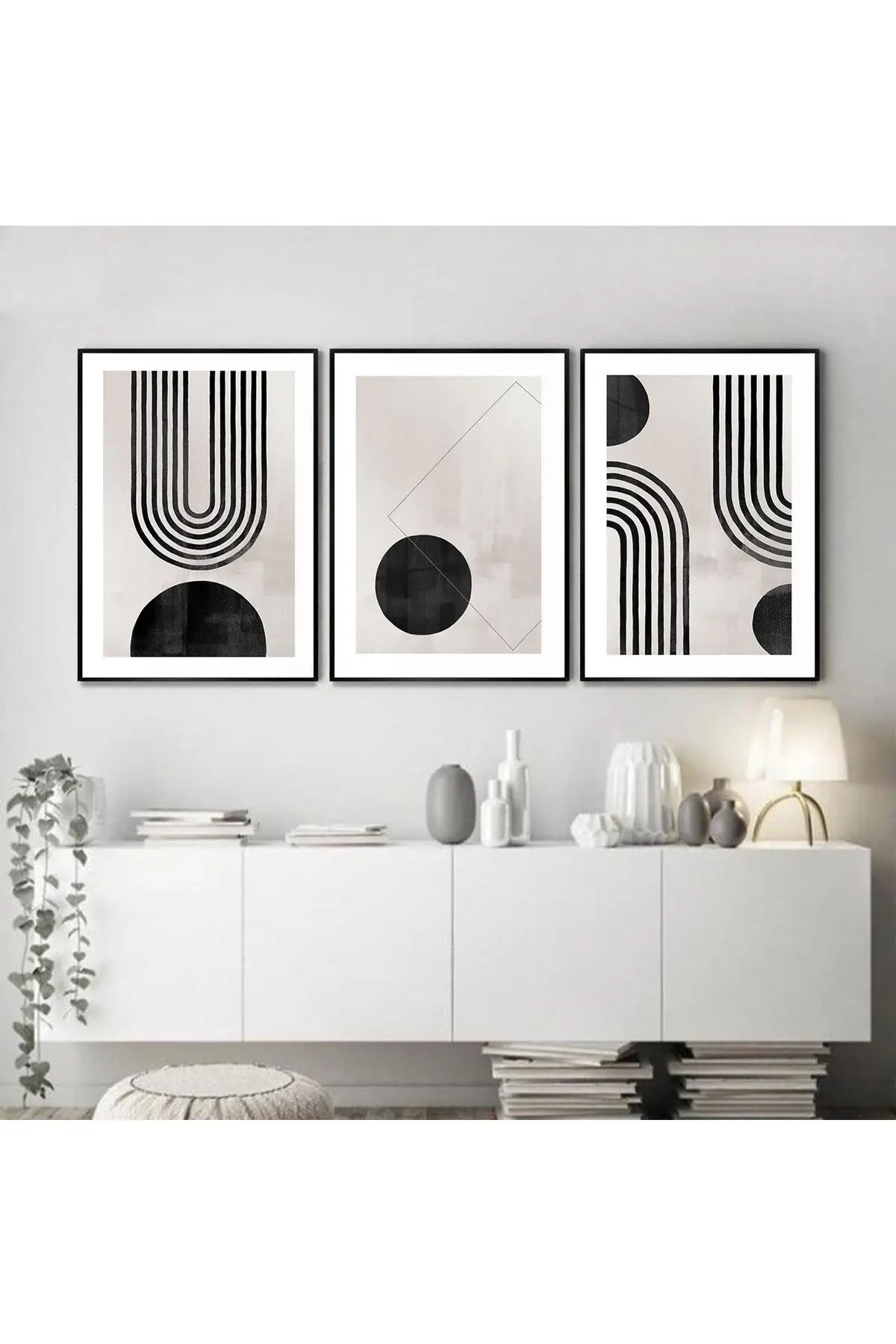 Geometrik Elegans: Soyut Siyah Beyaz Metal Çerçeveli Üçlü Tablo Seti Hakkında