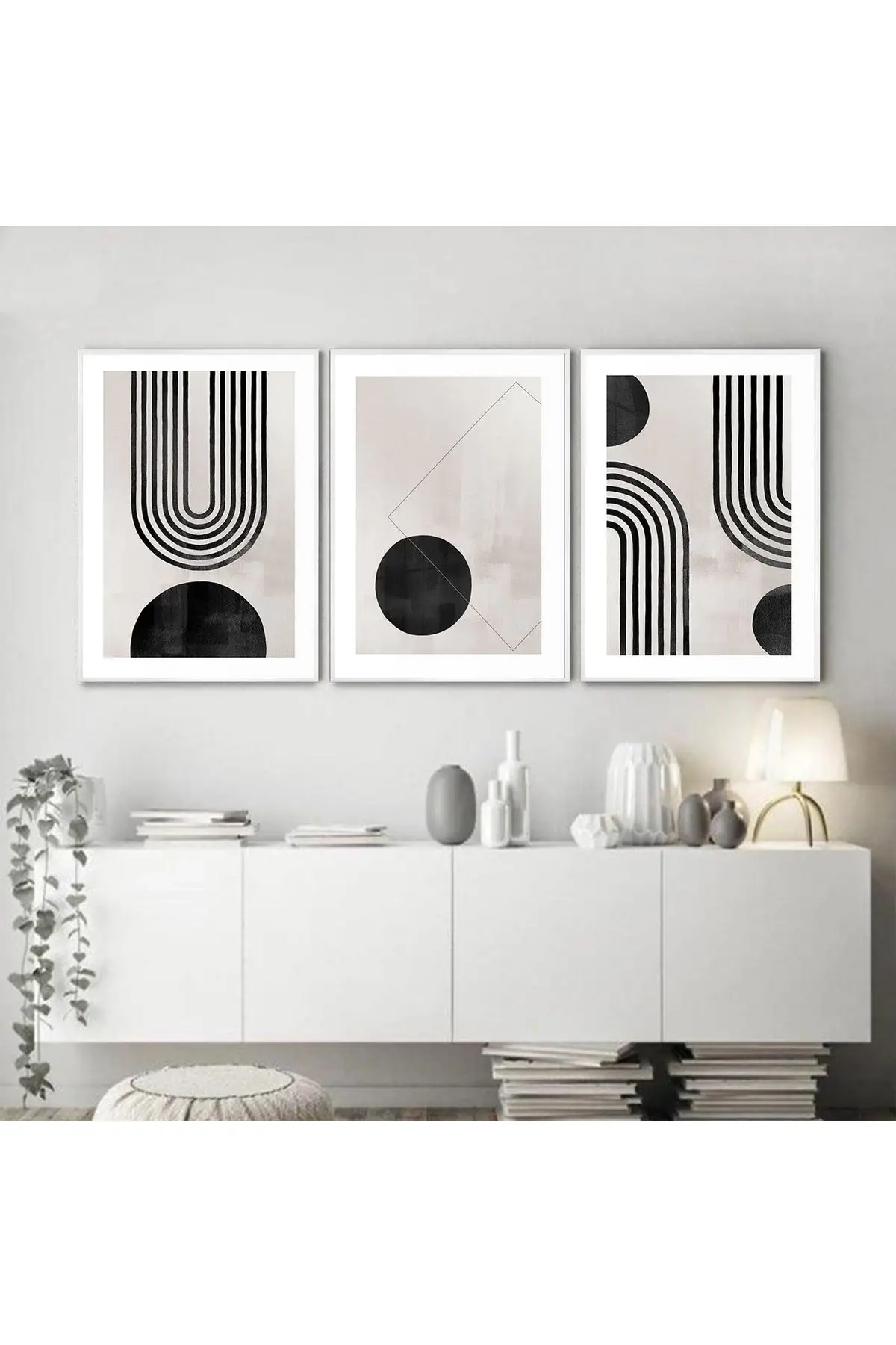 Geometrik Elegans: Soyut Siyah Beyaz Metal Çerçeveli Üçlü Tablo Seti Hakkında