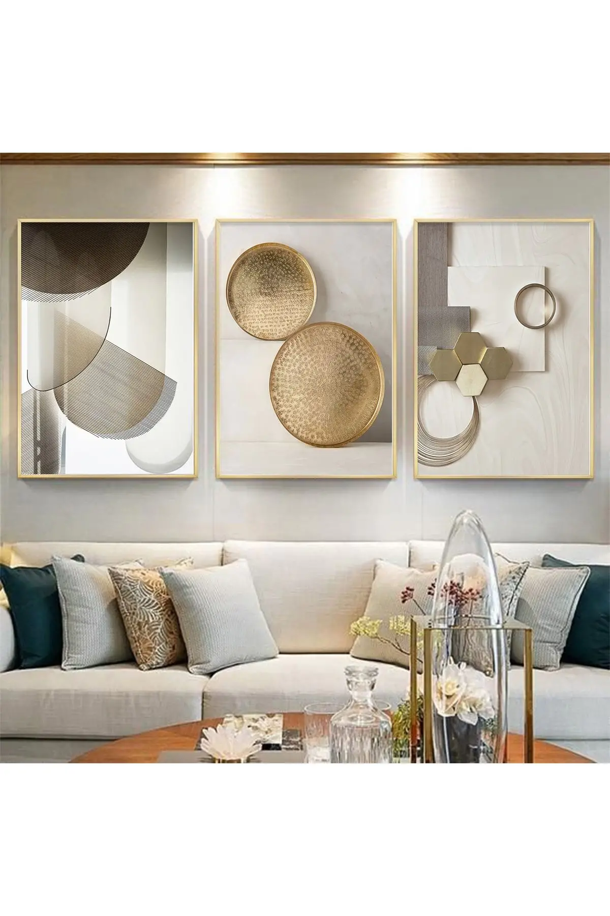 Geometrik Şıklık: Modern Formların Altın Ve Bej Tonlarında Buluşması Gold Metal Çerçeveli Tablo Seti Hakkında