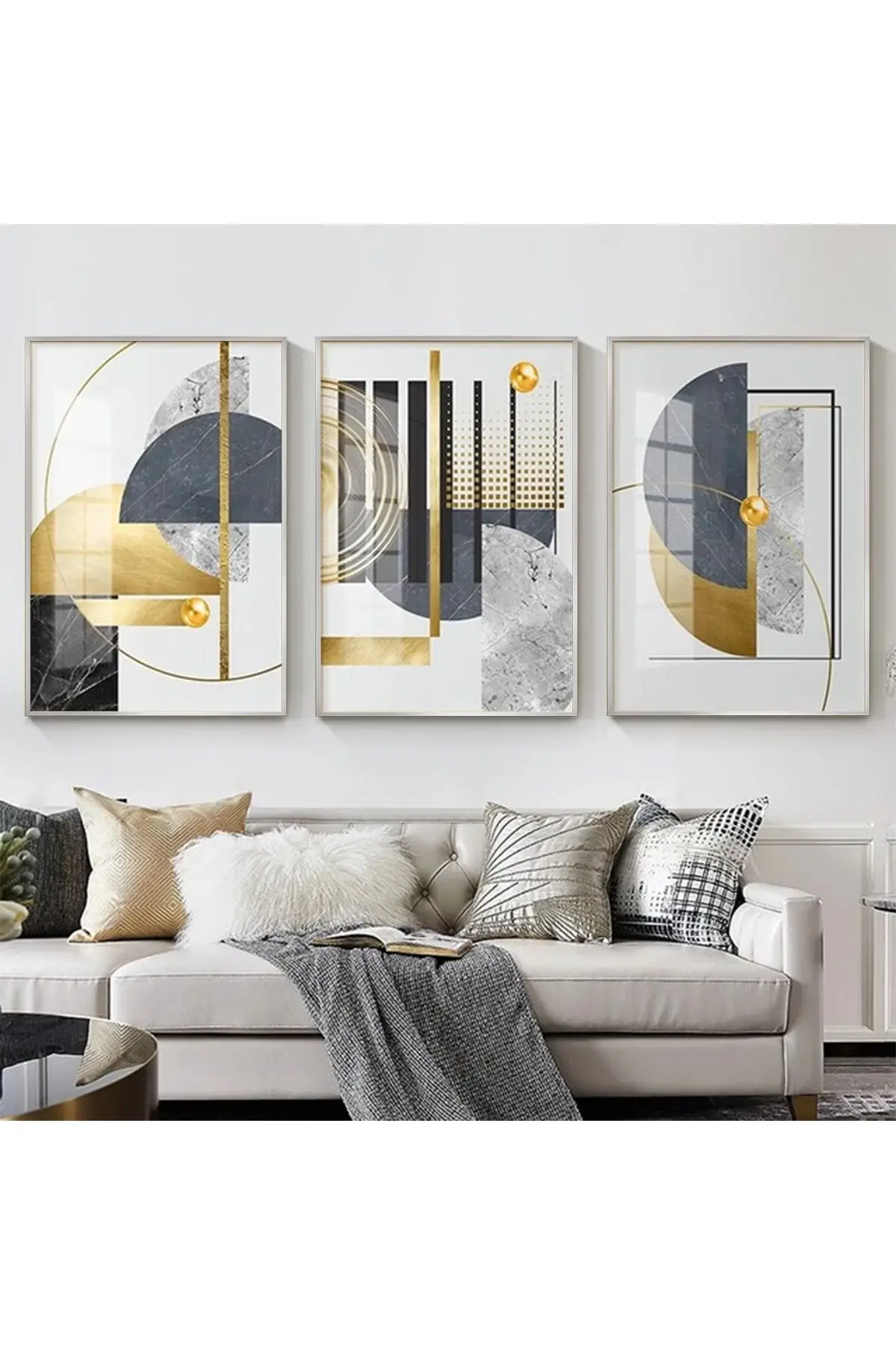 Geometrik Zarafet: Altın ve Siyahın Dansı Üçlü Metal Çerçeveli Tablo Takımı Hakkında