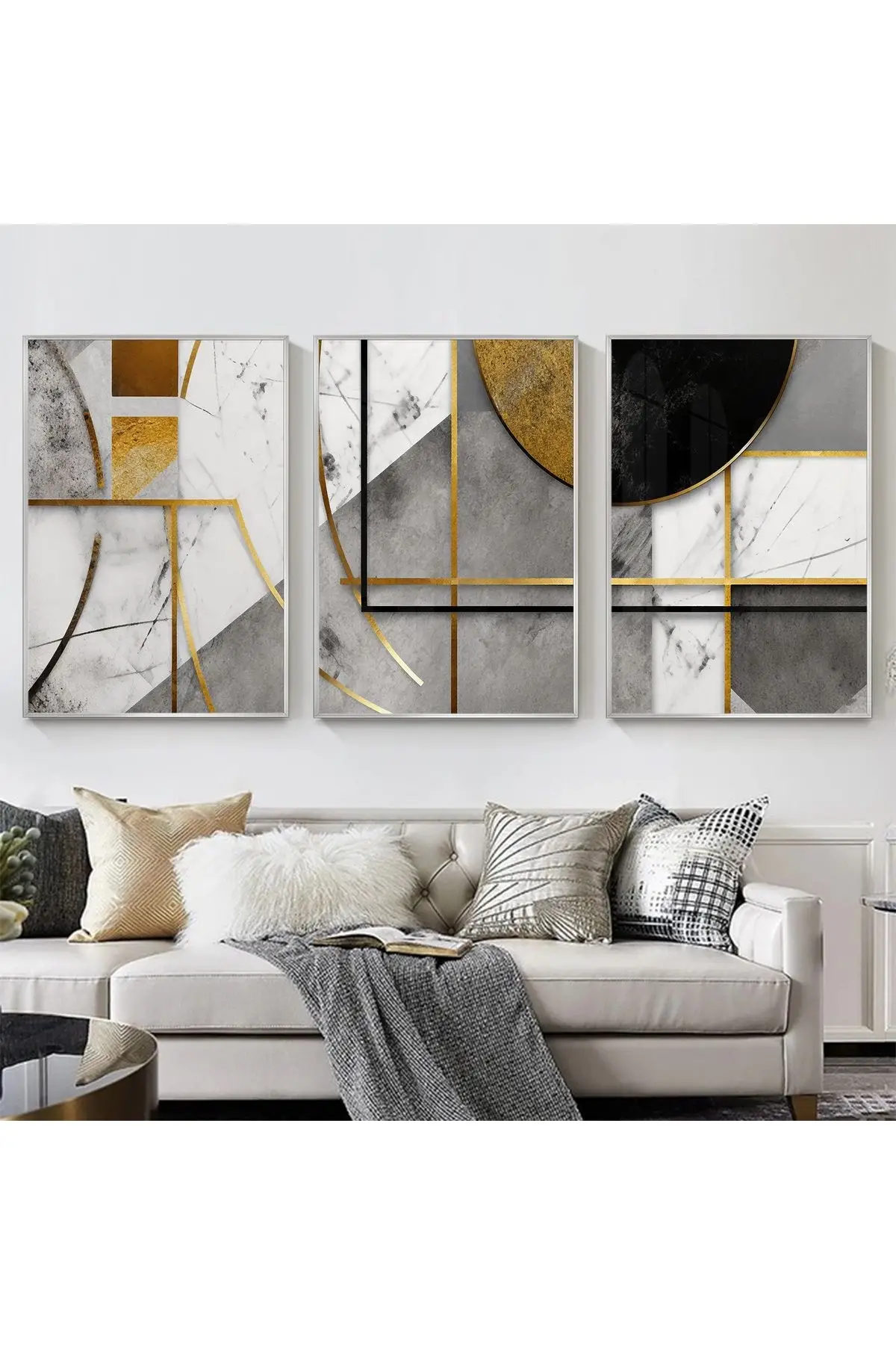 Geometrik Zarafet: Üç Parçalı Metal Çerçeveli Tablo Seti Hakkında