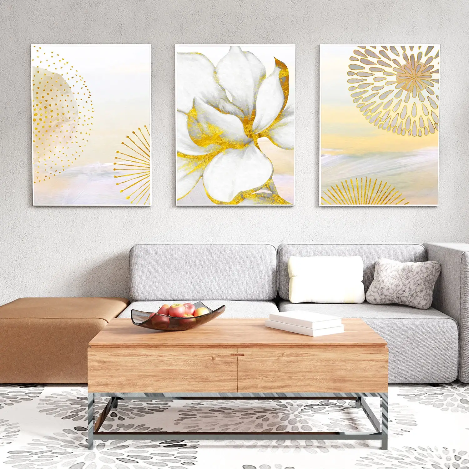 Gold Çiçekler Temalı Üçlü Metal Çerçeveli Tablo Seti