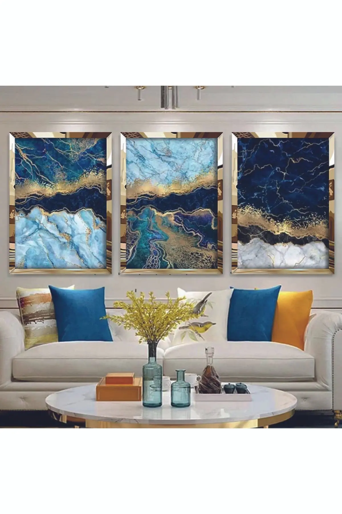 Gold ve Mavinin Mükemmel Uyumu Mermer Dokulu 3'lü Gold Pleksi Tablo Hakkında