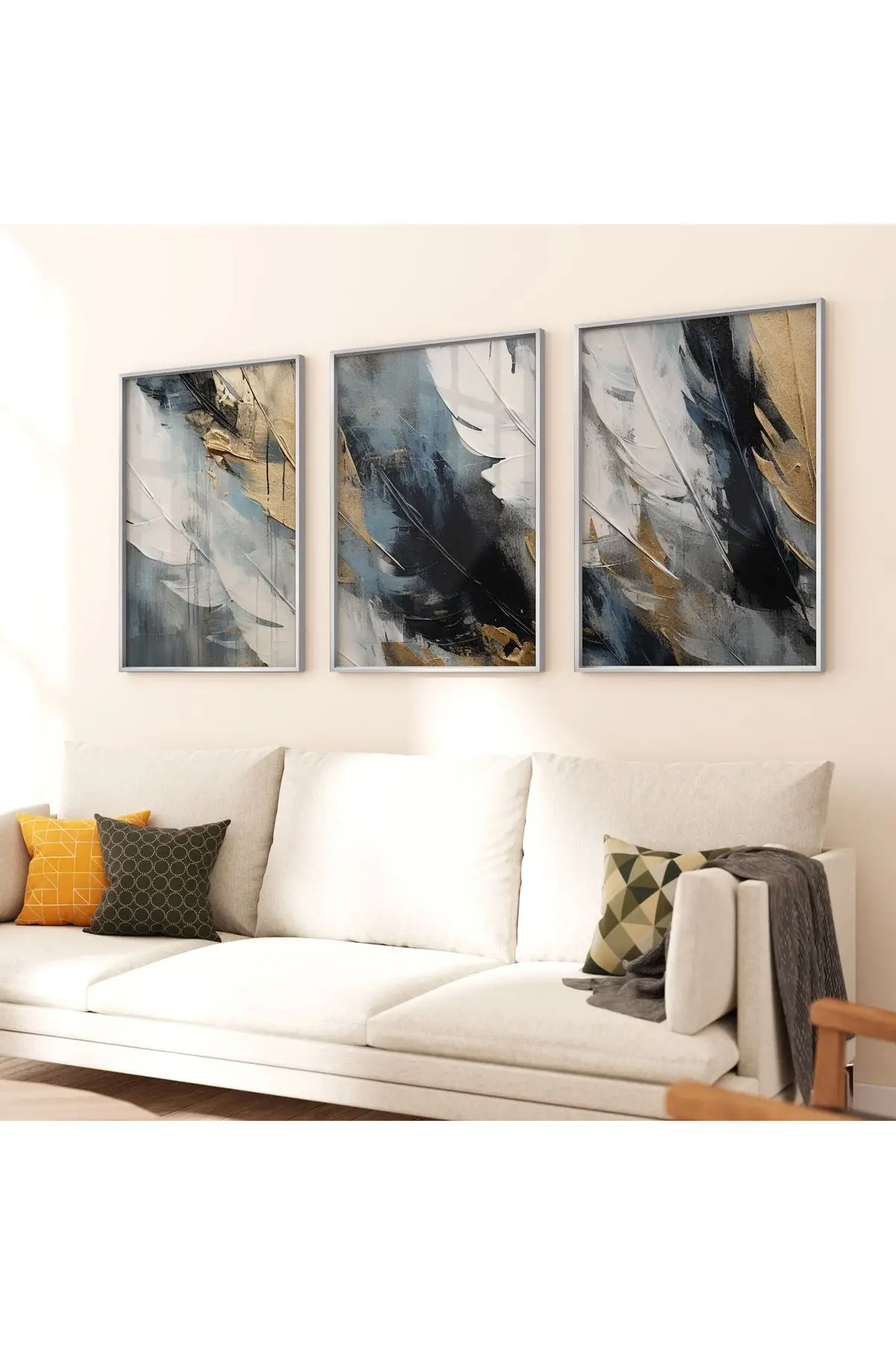 Hafif Dokunuşlar: Beyaz ve Altın Tüy İzleri Üçlü Metal Çerçeveli Tablo Seti Hakkında