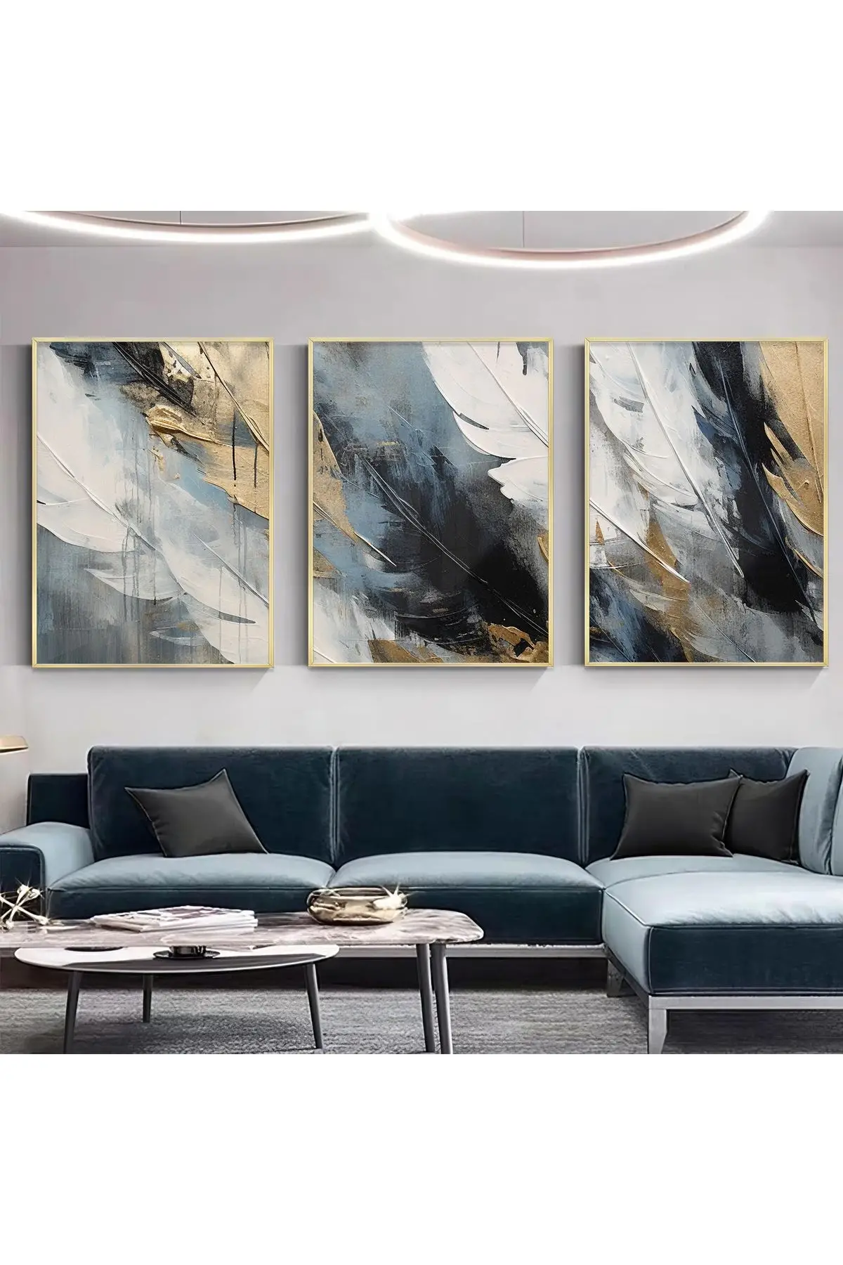 Bu üçlü tablo seti, deniz mavisi, beyaz, siyah ve altın renklerinin dinamik fırça darbeleriyle modern bir estetik yaratır. %100 alüminyum metal çerçeve ve gerçek kırılmaz cam kullanılarak üretilmiş bu eserler, UV baskı teknolojisi ile canlı renkler ve uzun ömürlü bir görsel deneyim sunar.