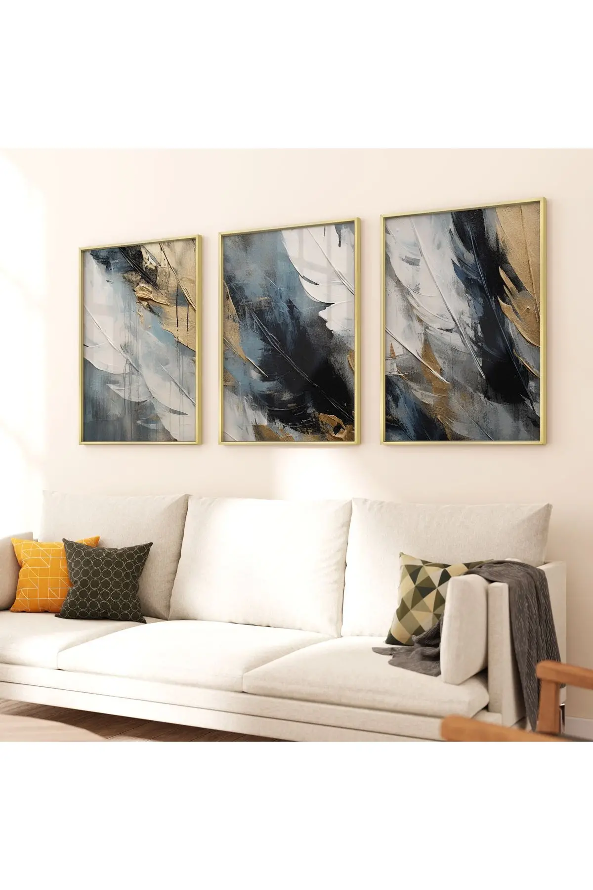 Hafif Dokunuşlar: Beyaz ve Altın Tüy İzleri Üçlü Metal Çerçeveli Tablo Seti Hakkında