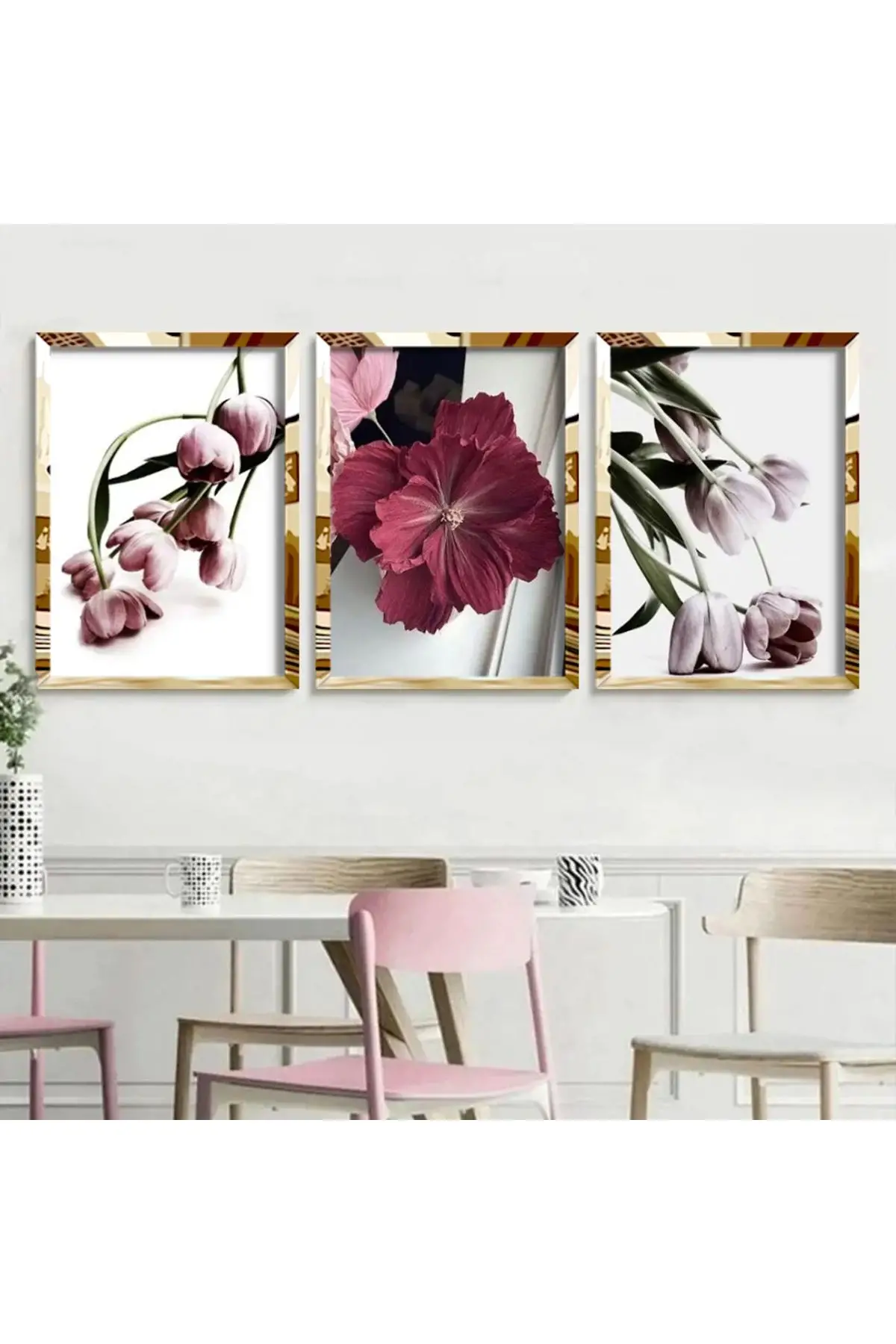 Kırmızı Japon Gülü ve Laleler Gold Pleksi 3'lü Çerçeveli Tablo Seti Hakkında