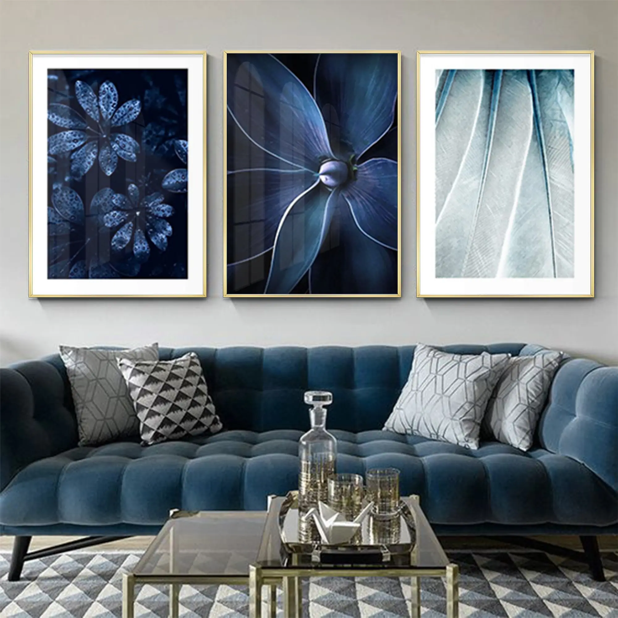 Lacivert Çiçek Desenli Metal Çerçeveli Tablo Seti Altın Hakkında