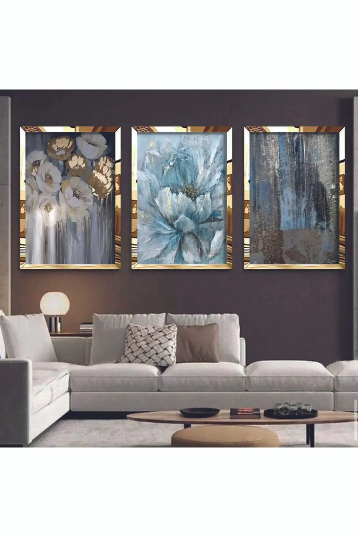 Mavi-gold Modern Çiçek Gold Pleksi 3'lü Çerçeveli Tablo Seti Hakkında