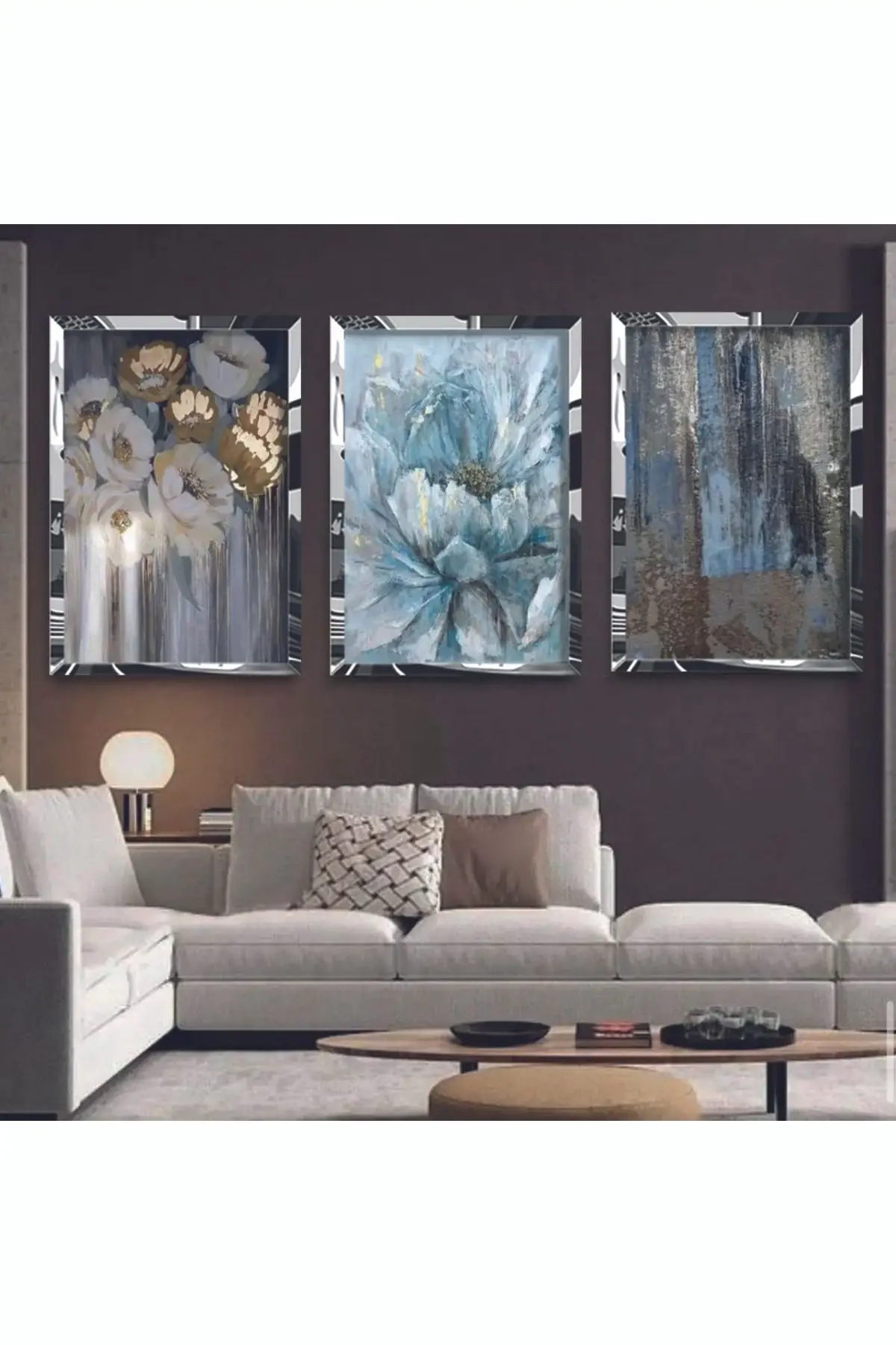 Mavi-gold Modern Çiçek Gümüş Pleksi 3'lü Çerçeveli Tablo Seti Hakkında