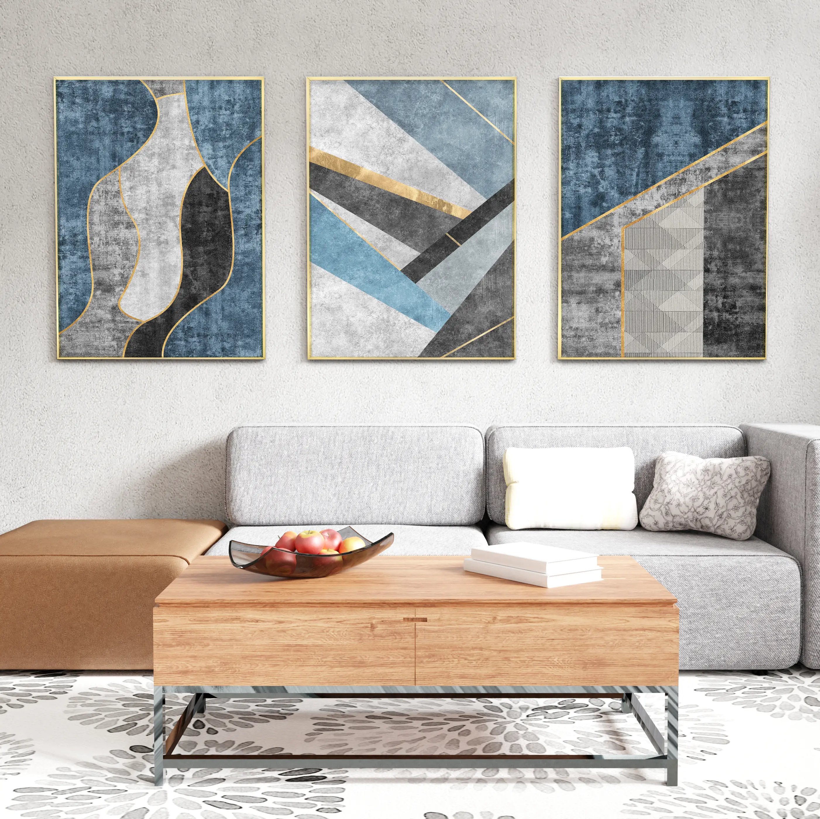 Üç farklı geometrik şeklin mavi ve gri tonlardaki zarif detayları, evinizin duvarlarında göz alıcı bir görünüm yaratacak.
