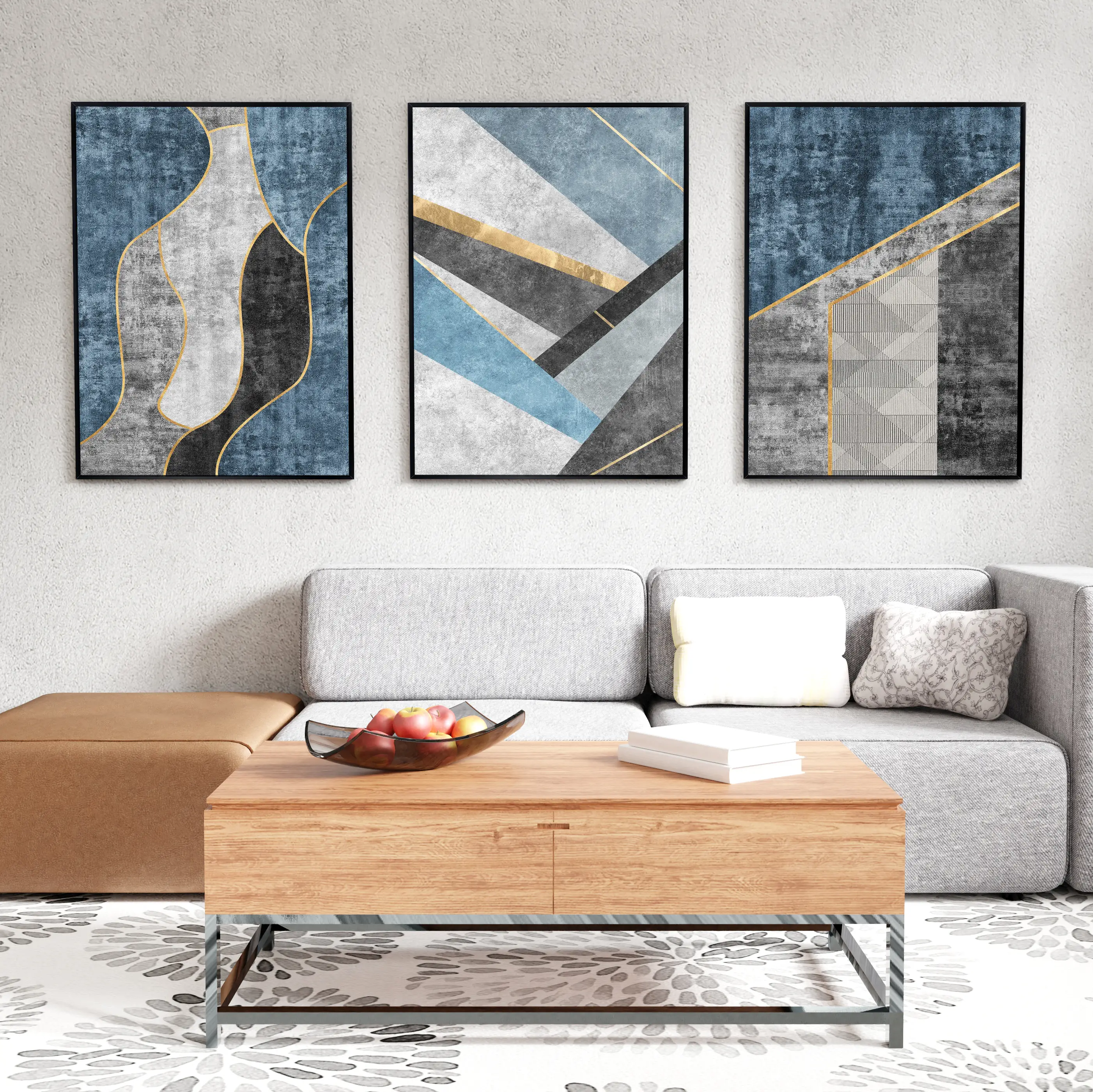 Üç farklı geometrik şeklin mavi ve gri tonlardaki zarif detayları, evinizin duvarlarında göz alıcı bir görünüm yaratacak.