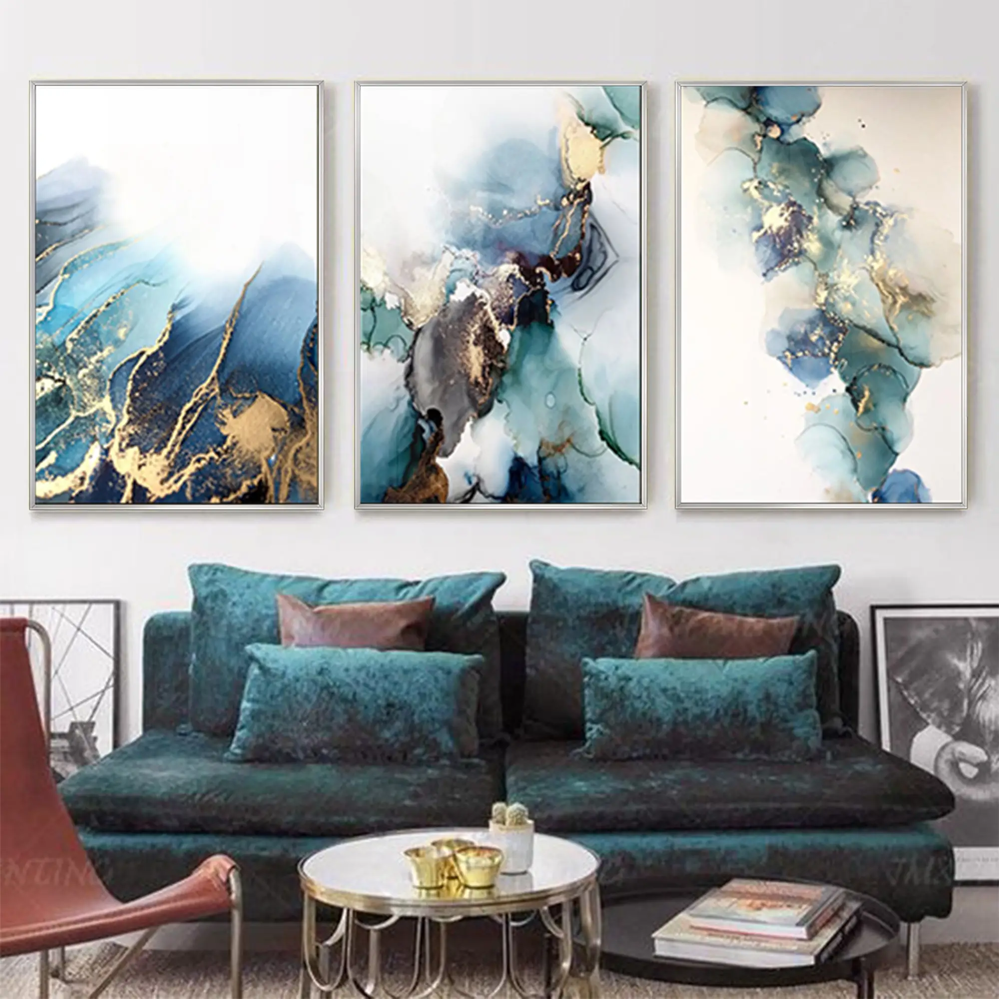 Mavi Yeşil Mermer Desenli Metal Çerçeveli Tablo Seti Gümüş Hakkında