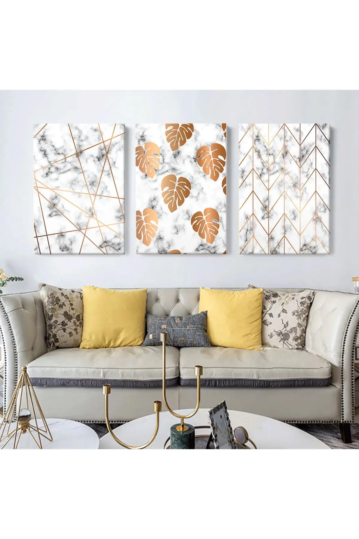 Mermer Üzerinde Altın Detaylar: Soyut Desenli Üçlü Kanvas Tablo Seti Hakkında
