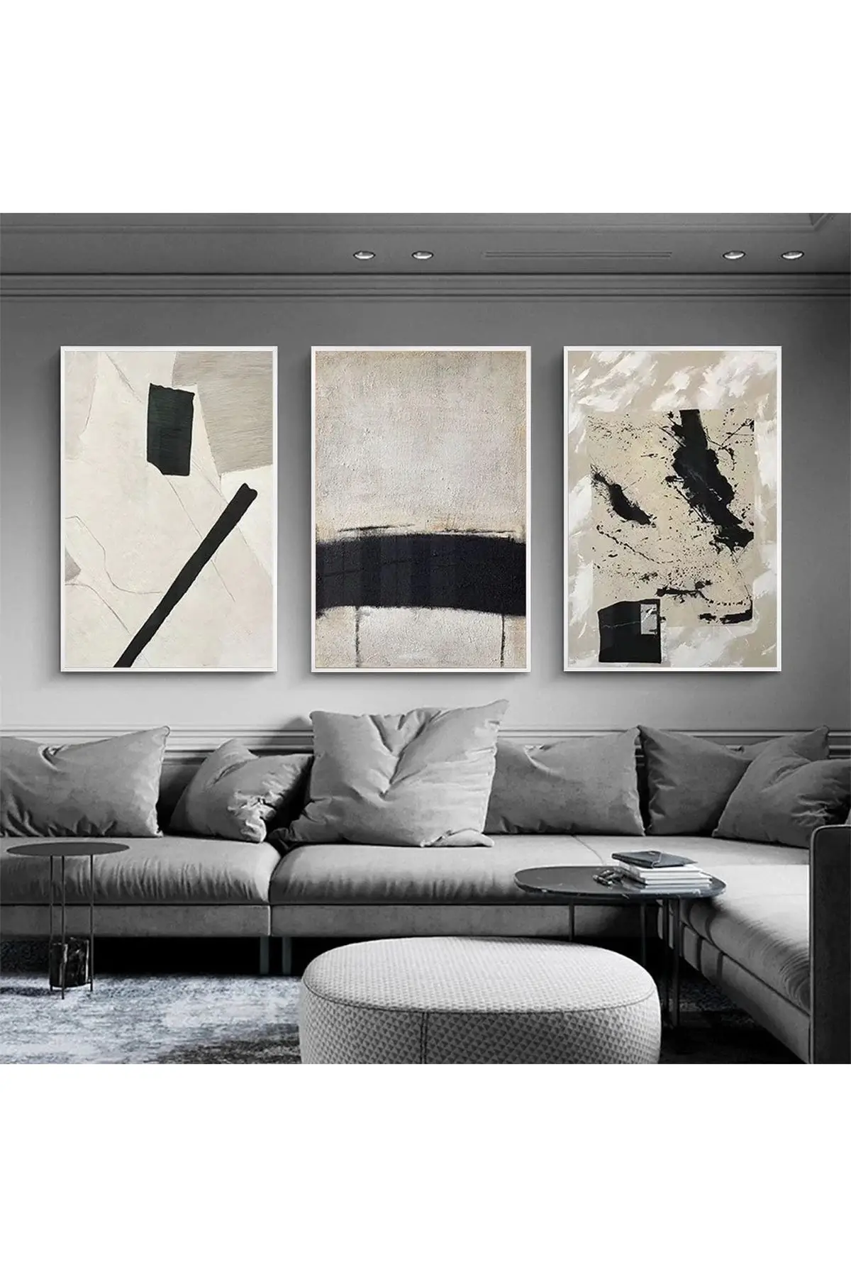 Monokromatik Şıklık: Bej ve Siyahın Kontrastı Üçlü Metal Çerçeveli Tablo Seti Hakkında