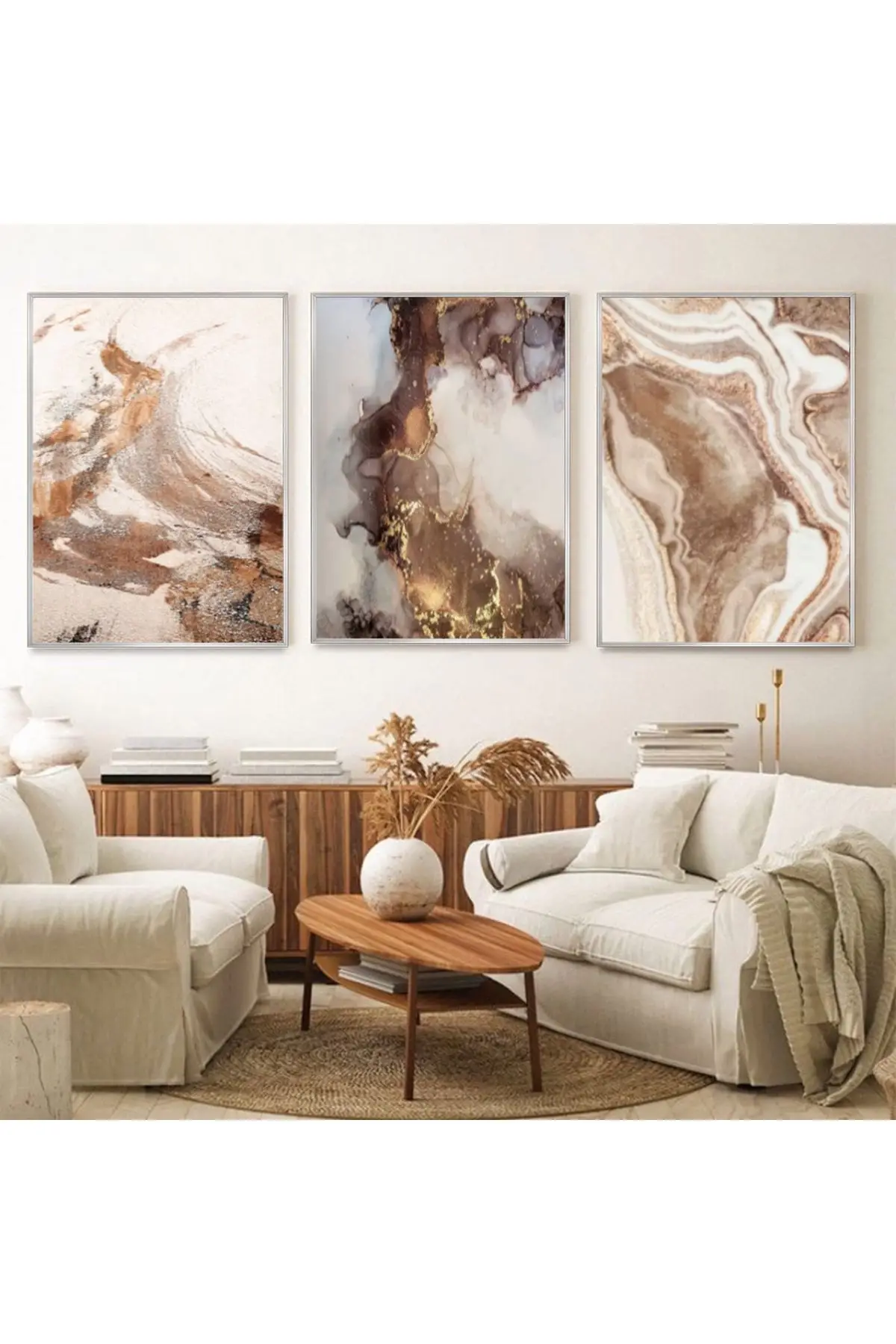 Organik Elegans: Sıcak Mermer Desenli Üçlü Metal Çerçeveli Tablo Seti Hakkında