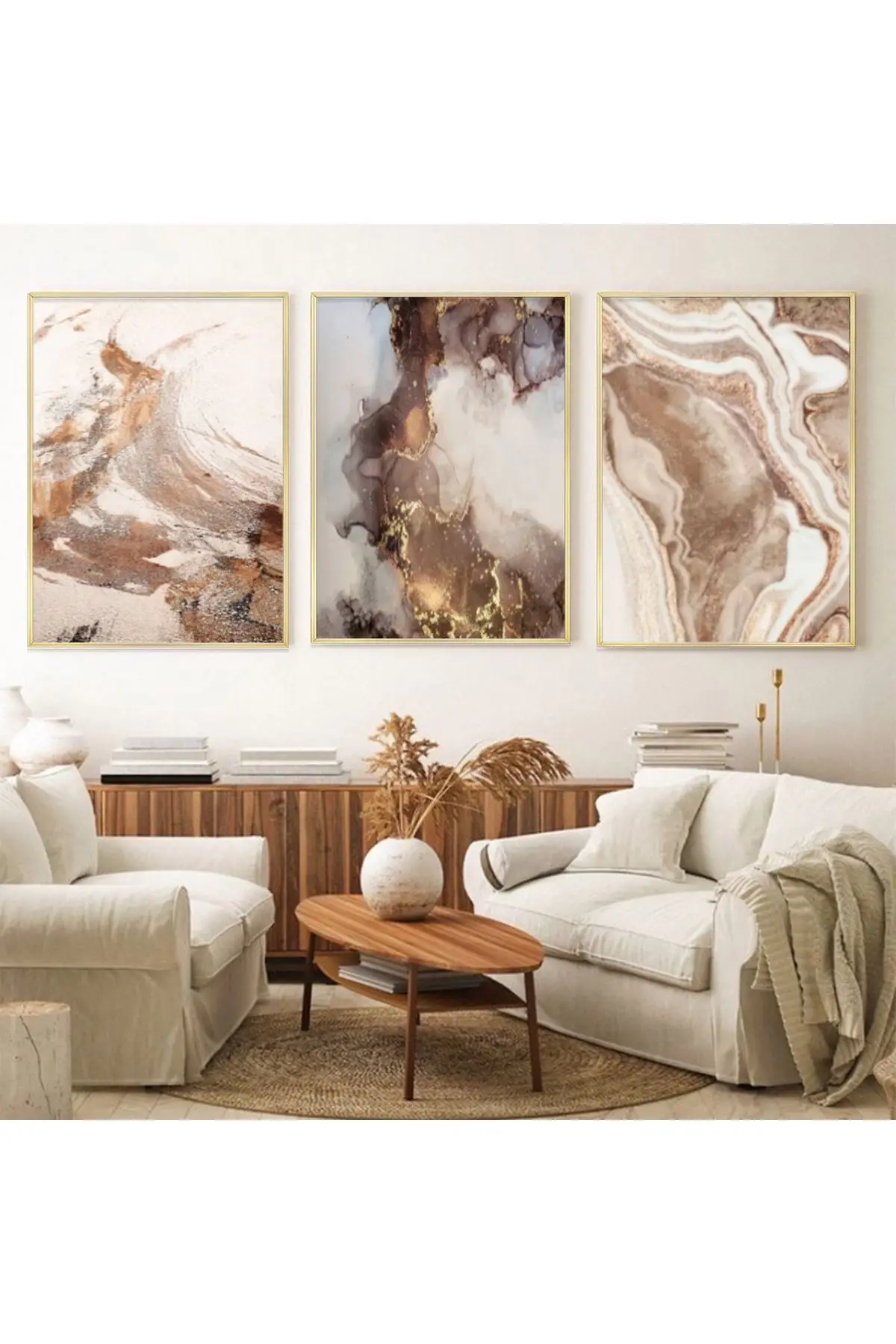 Organik Elegans: Sıcak Mermer Desenli Üçlü Metal Çerçeveli Tablo Seti Hakkında