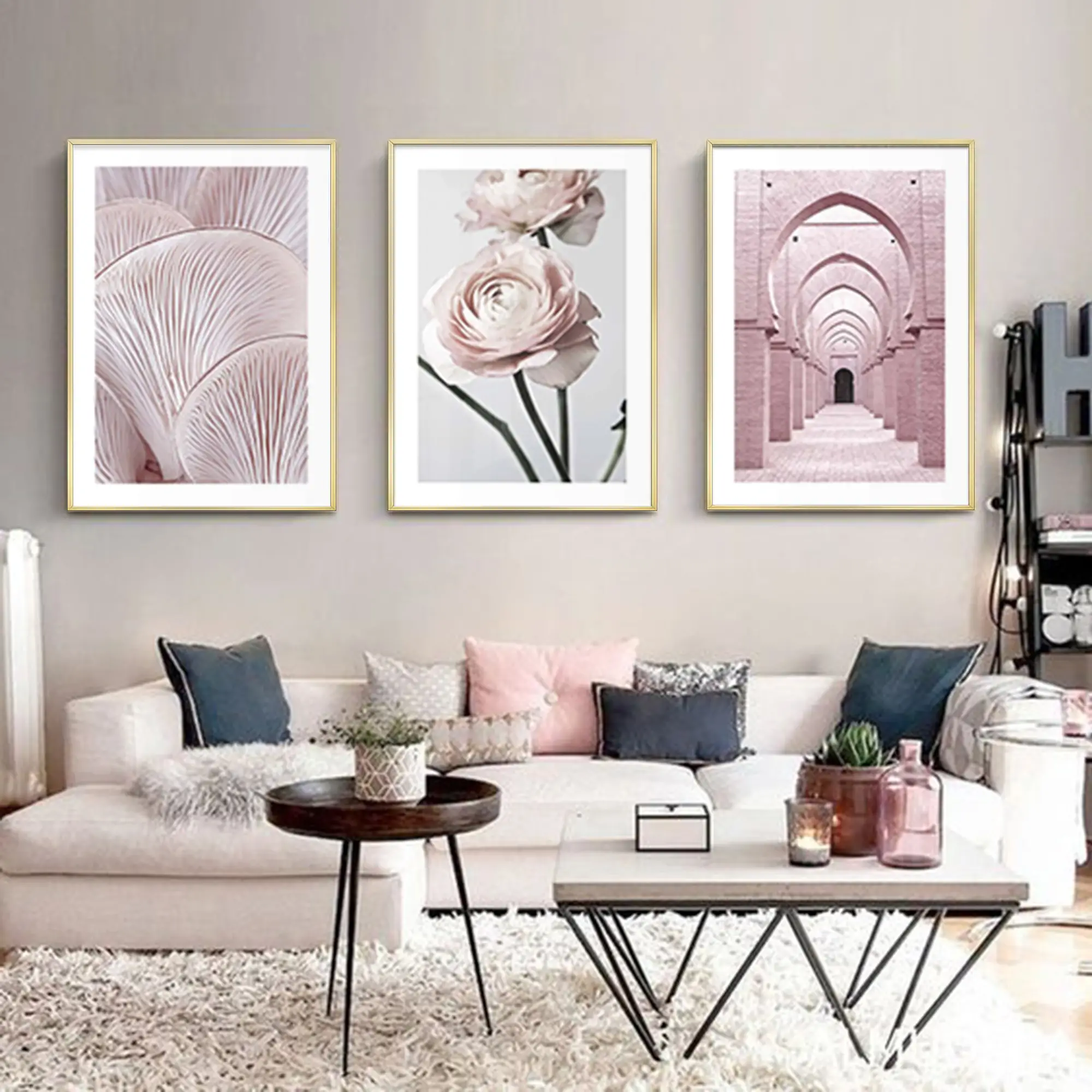 Pembe Çiçekler Beyaz Kenarlı Metal Çerçeveli Tablo Seti Altın Hakkında