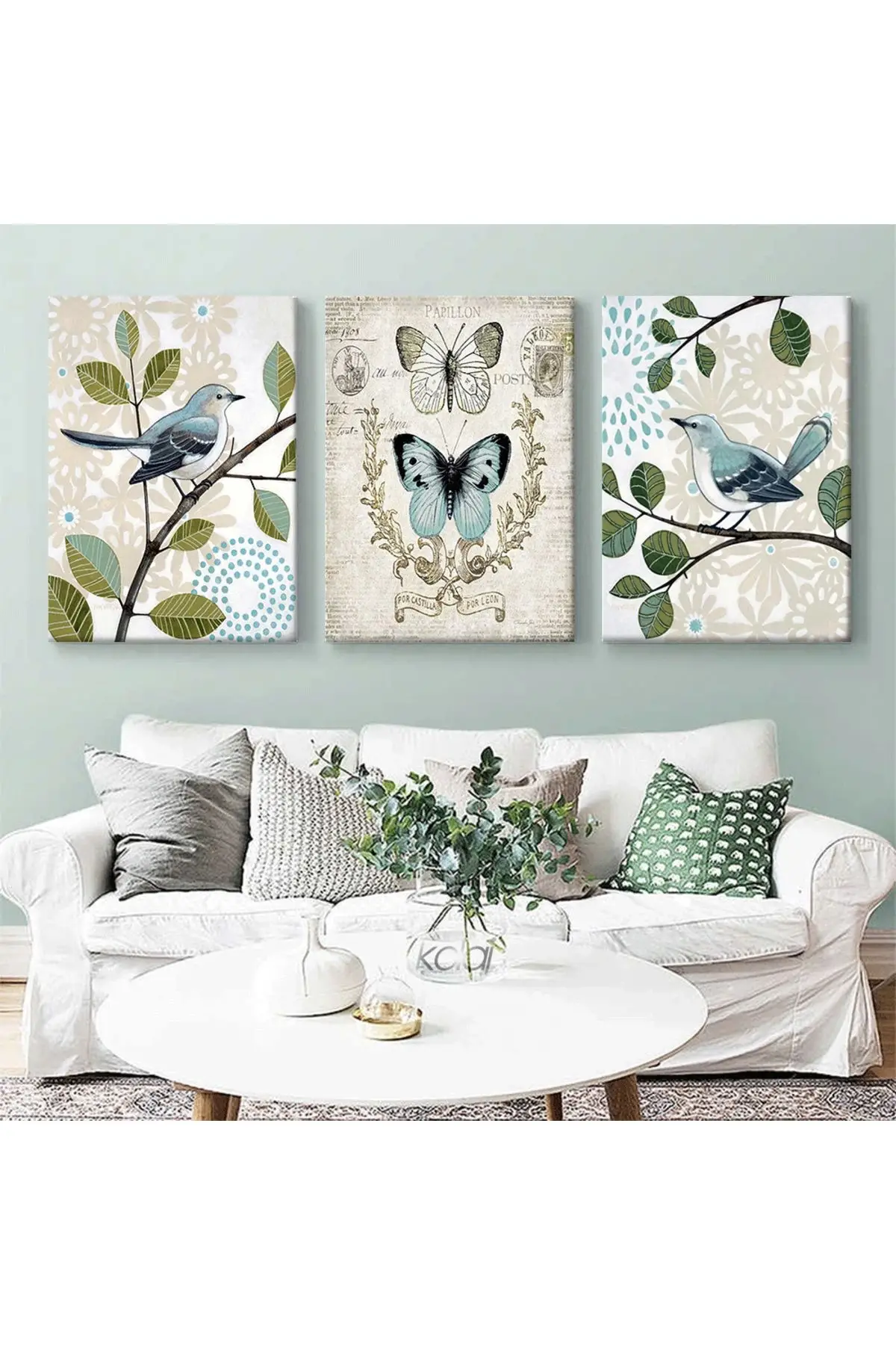 Retro Country Tarzı Dalda Mavi Kuşlar ve Kelebek Üçlü Kanvas Tablo Seti Hakkında