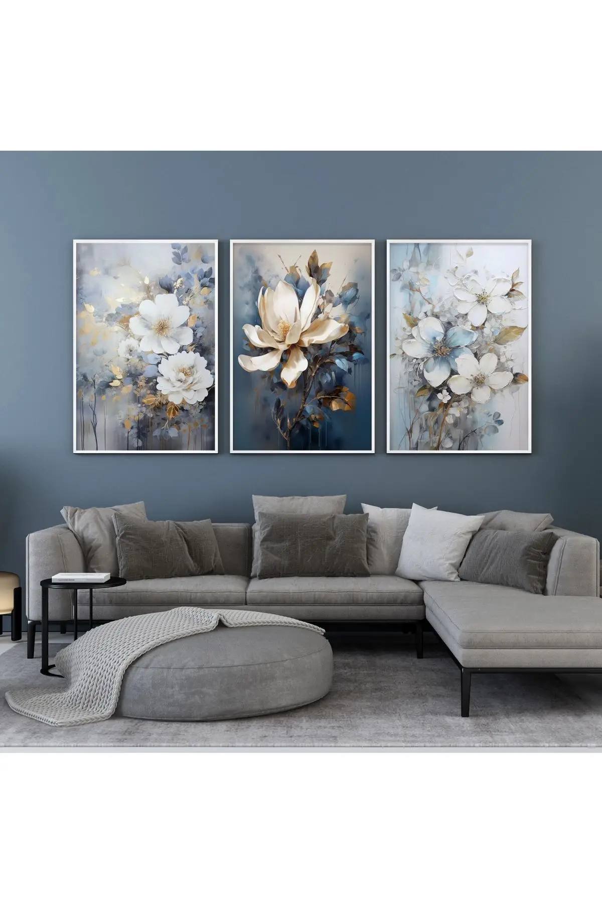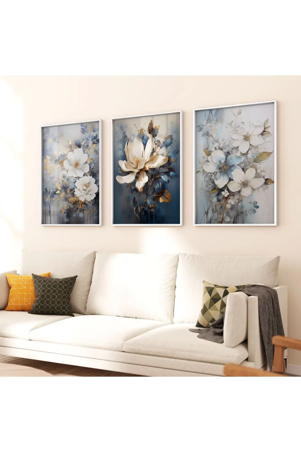 Bu şık tablo seti, herhangi bir modern oturma odasına sofistike bir dokunuş katar. %100 alüminyum metal çerçevede, canlı renklerle UV baskılı beyaz çiçekler, uzun ömürlü ve etkileyici bir görsel sunar. Gerçek kırılmaz cam kullanımı, parlaklığı ve netliği artırırken, mavi ve altın renk detaylarıyla zenginleştirilmiş tasarımıyla dikkat çeker.