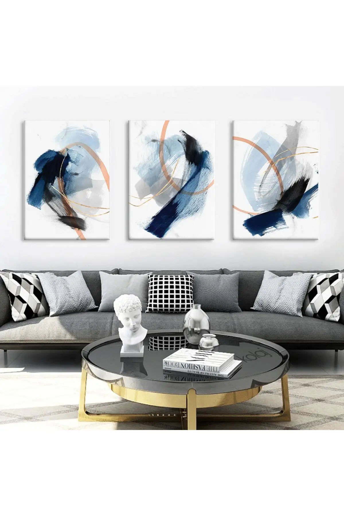Soğuk Renkler Kombinasyonu Altın Çizgiler ve Mürekkep Sıçramaları Sanatsal Üçlü Kanvas Tablo Seti Hakkında