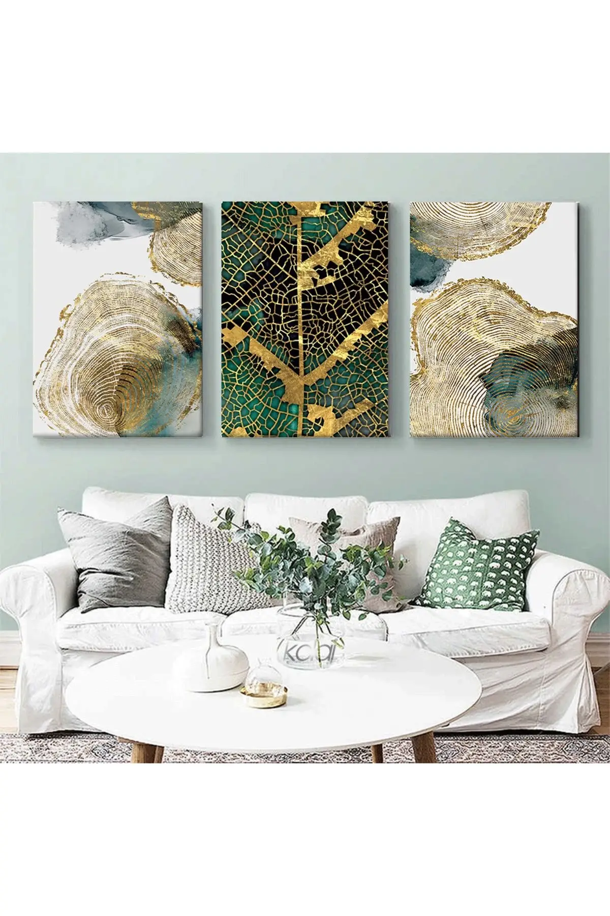 Soyut Modern Altın Detaylı Yaprak Üç Parçalı Kanvas Tablo Seti Hakkında